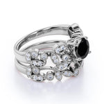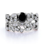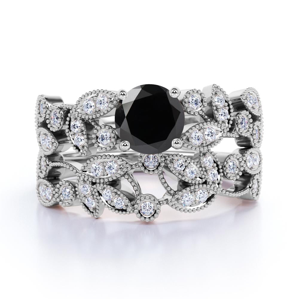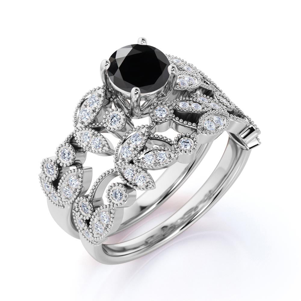 Modern Art Deco 1.50 Carat Round Brilliant Cut Lab Black Diamond and Leaf Bridal Ring Set in White Gold