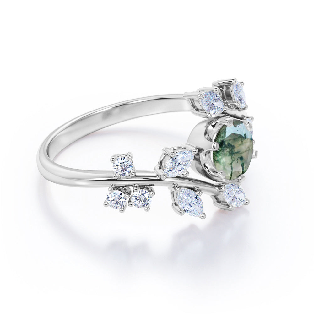 Paint your love story with this Modern Floral Style 1 Carat Round Cut Natural Translucent Dendritic Moss Green Agate and Diamond Art Deco Engagement Ring. This non traditional Agate ring features 0.5 carat round cut real moss green agate and .50 carat real side diamond for gold ring and moissanite for silver ring. This nature-inspired engagement ring can be customized to either 10k, 14K and Gold over Silver and either Black Gold, Rose Gold, White Gold or Yellow Gold. Also, as your satisfaction is our most priority, we will do our best to have your handmade jewelry be carefully and beautifully crafted by our expert jewelers. The order also comes with a 30-day full refund policy. This green colored minerals with banded inclusions ring will surely be a perfect gift for your special someone. It is crowned as a crystal of gardeners and agriculture. Encourage trust and hope with this real green Agate ring that shows a variety of white with green inclusions that resembles moss. The unique green color in its patterns will surely complement every style of its wearer. Perfect for everyday wear, this polished veined moss green Agate gemstone is resistant to chemical attack. This ring is available at a very affordable price and available in both silver and gold ring. With its moss-like inclusions, this ring will make you shine and stand out from others. Being named a growth crystal, this real dendritic moss green Agate encourages spiritual growth and renewed commitment to a higher purpose. Those who has a penchant for vintage and flawless ring would completely fall in love with this ring. It is the perfect match for those who are looking for a remarkable gemstone rings as moss green Agate embodies their own unique intriguing patterns and uplifting meaning.