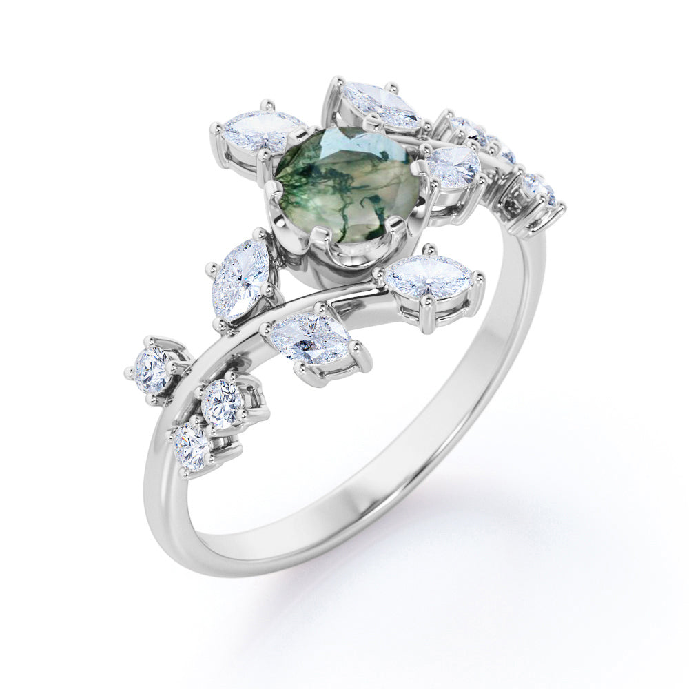 Modern Floral Style 1 Carat Round Cut Natural Translucent Dendritic Moss Green Agate and Diamond Art Deco Engagement Ring
