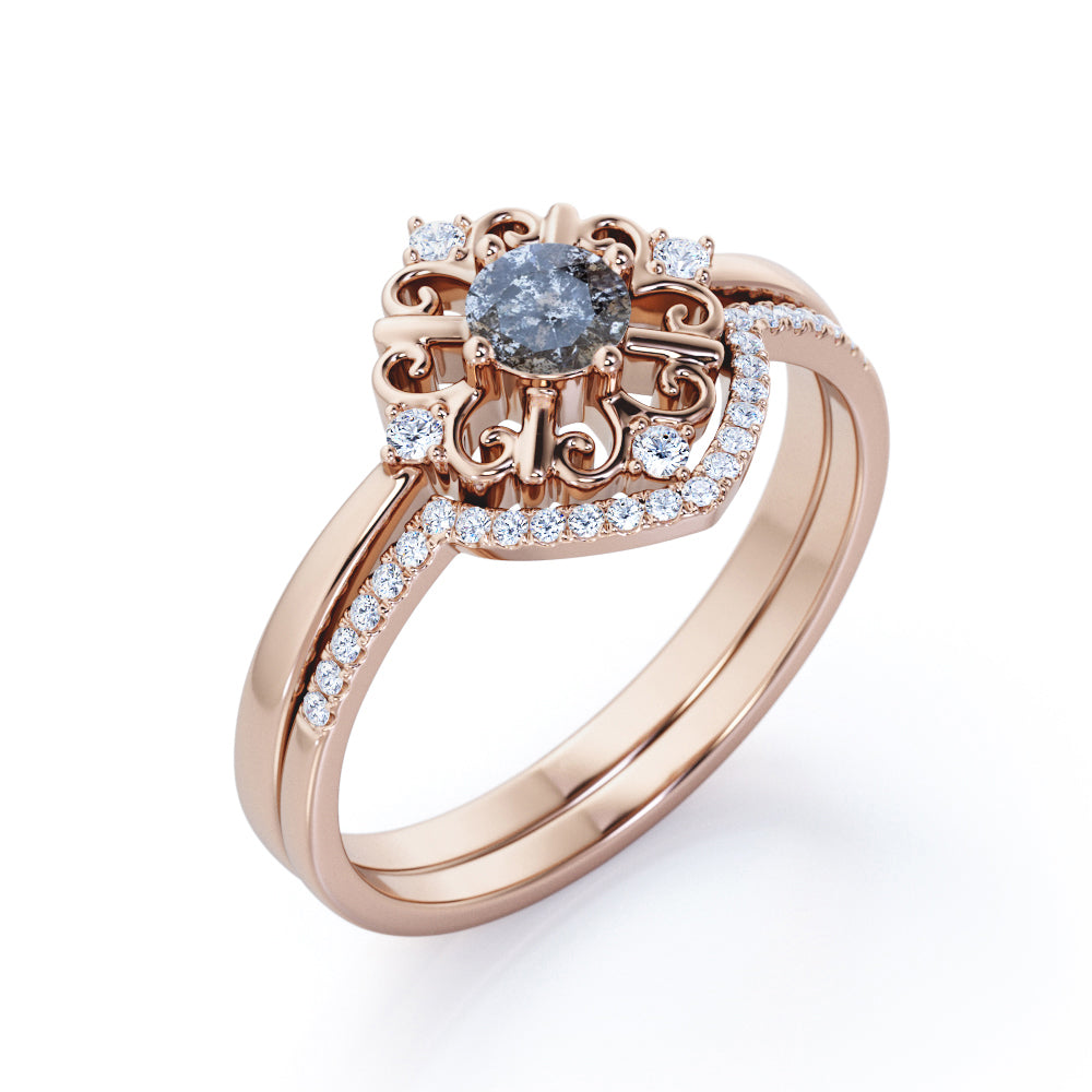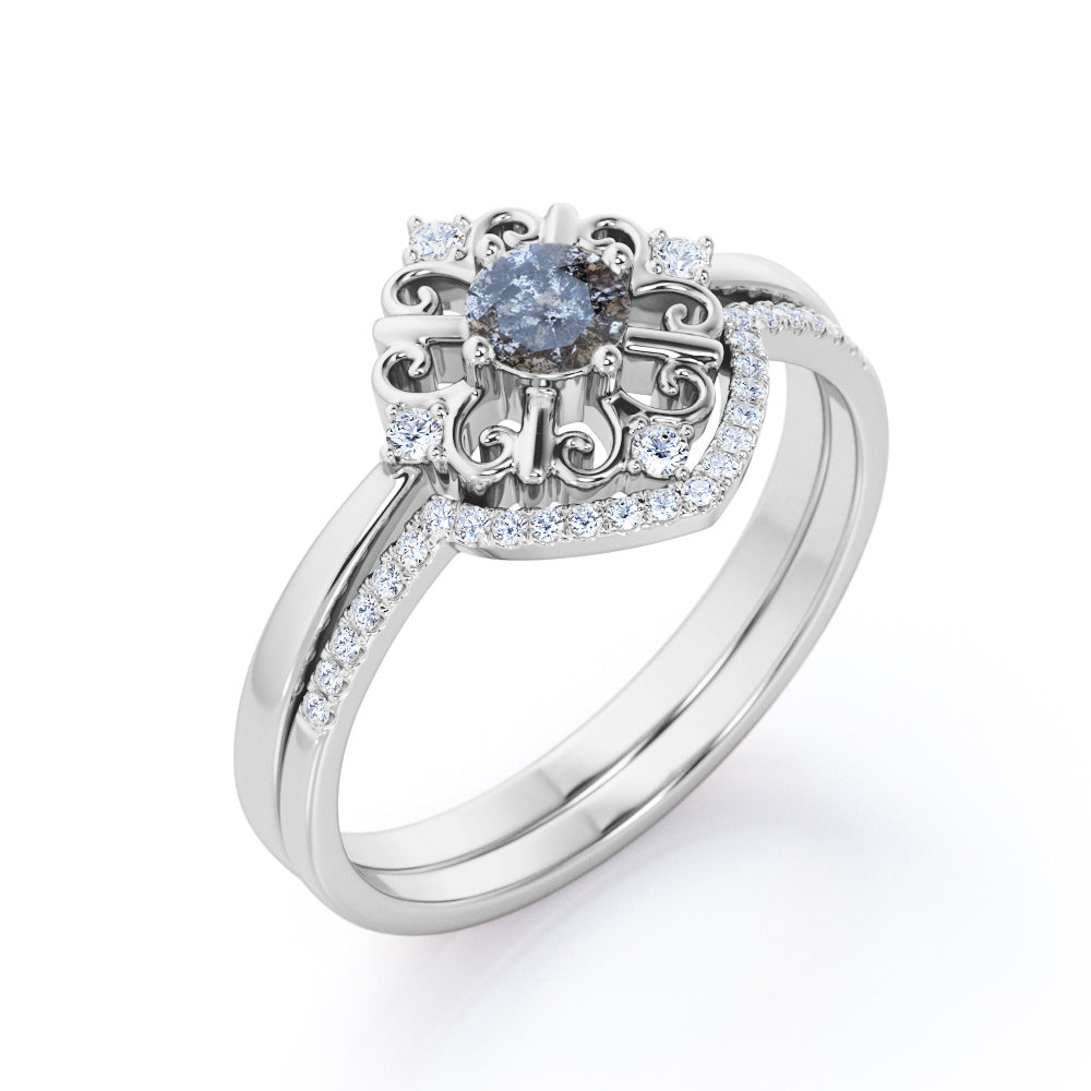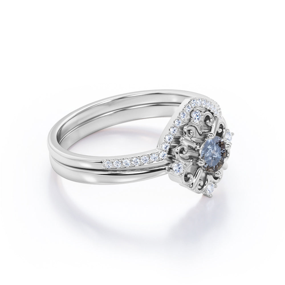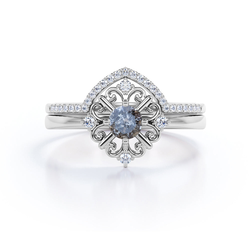 IMPORTANT NOTE: Since each Salt and Pepper Diamonds is one of a kind, the actual color of it may vary from the one that is pictured above. Thanks to its enchanting black and white inclusions, this Modern Leaf Outline 5 Stone 0.85 Carat Round Cut Fancy Dark Grey Salt and Pepper Diamond and Contour Pave Band Bridal Set Rings will be as unique as its wearer. This unique ring features .50 carat round cut natural Salt and Pepper Diamond and .35 carat real side Diamond for gold ring and Moissanite for silver ring. This elegant wedding set rings can be customized to either 10k, 14K and Gold over Silver and either Black Gold, Rose Gold, White Gold or Yellow Gold. Also, as your satisfaction is our most priority, we will do our best to have your handmade jewelry be carefully and beautifully crafted by our expert jewelers. The order also comes with a 30-day full refund policy. This ring will be a perfect gift for any occasions: birthday, anniversary, proposal, Valentine's day, Christmas, and any other special events. This ring is very exclusive due to the unique inclusions of Salt and Pepper Diamond that appears black and white. If you are looking for alternate gemstone, this Salt and Pepper Diamond is right for you. It is eco-friendly, ethical, and environmental friendly. Being considered a very eccentric gemstone, this ring will create a timeless and fabulous engagement ring. Create a fascinating look on your finger with this Salt and Pepper Diamond ring for women which is available in both solid gold and sterling silver. Impress your special someone with this beautiful and affordable ring. Its inclusions reminds us that beauty doesn't always lie in perfection. Handcrafted with love, this antique ring will complement any style and enhance the charm of its wearer.