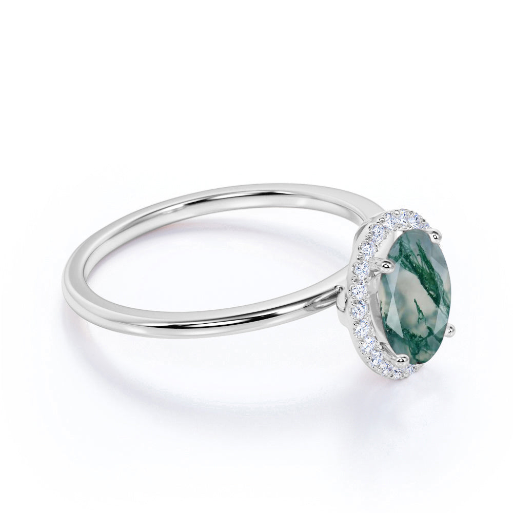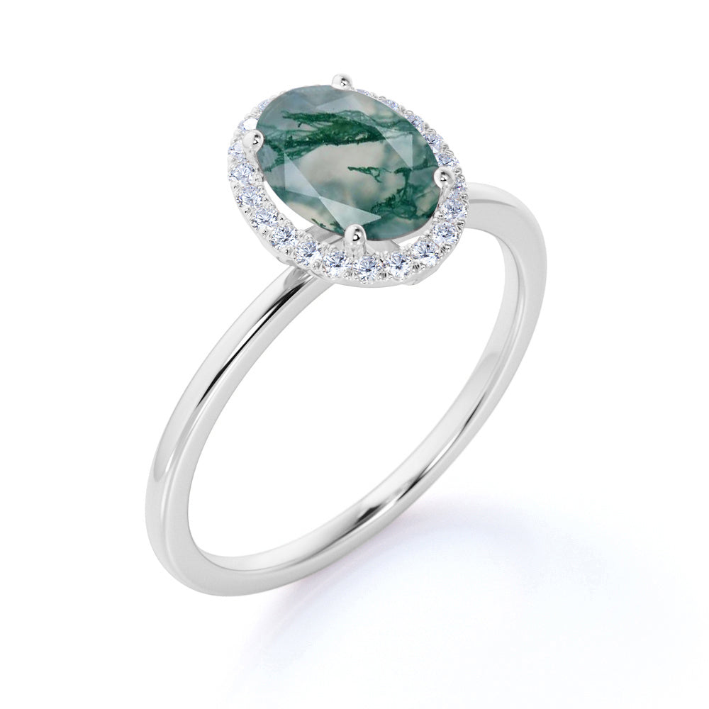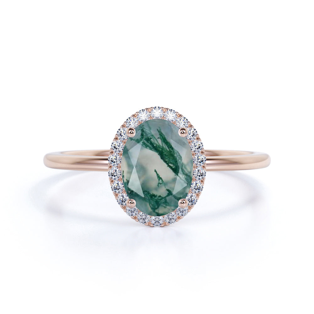 Modern Simple Solitaire 1.75 Carat Oval Cut Cloudy Milky White Moss Green Agate and Diamond Halo Engagement Ring in Rose Gold for Her