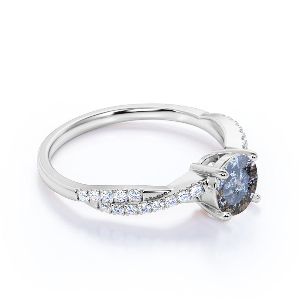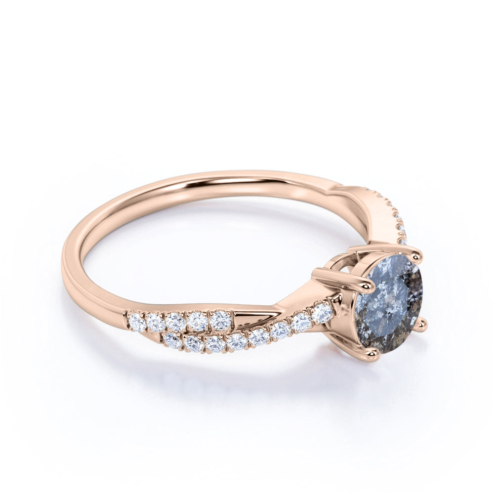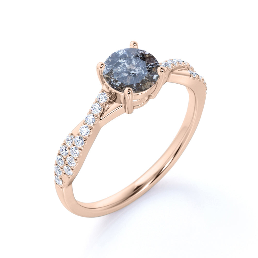 IMPORTANT NOTE: Since each Salt and Pepper Diamonds is one of a kind, the actual color of it may vary from the one that is pictured above. Handcrafted with love, this Modern Solitaire .75 Carat Round Cut Natural Icy Dark Grey Salt and Pepper Diamond Twist Pave Engagement Ring will surely be as unique as you are. This unique Salt and Pepper Diamond ring features .50 carat round cut natural Salt and Pepper Diamond and .25 carat real side Diamond for gold ring and Moissanite for silver ring. This beautiful engagement ring can be customized to either 10k, 14K and Gold over Silver and either Black Gold, Rose Gold, White Gold or Yellow Gold. Also, as your satisfaction is our most priority, we will do our best to have your handmade jewelry be carefully and beautifully crafted by our expert jewelers. The order also comes with a 30-day full refund policy. Ideal gift for any special occasion, this ring can be gifted on birthday, anniversary, Valentine's day, Christmas, and proposal. With its unique appearance, you can be sure that no any other rings will look exactly alike. Ornament and distinguish your love story with the neat distribution of black and white inclusions of Salt and Pepper Diamond. It suits a variety of ring styles and easily adapted to suit any type of fashion sense. Design and create your very own unique ring that makes you outstanding from the rest! Create a fascinating look on your finger with this Salt and Pepper Diamond ring for women which is available in both solid gold and sterling silver. Sparkle your finger with this ring which is perfect for any occasion and everyday wear. Its inclusions reminds us that beauty doesn't always lie in perfection. It is the perfect match for those who are looking for a remarkable gemstone rings as Salt and Pepper embodies their own unique combination of color and uplifting meaning.