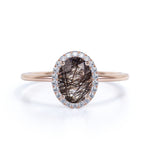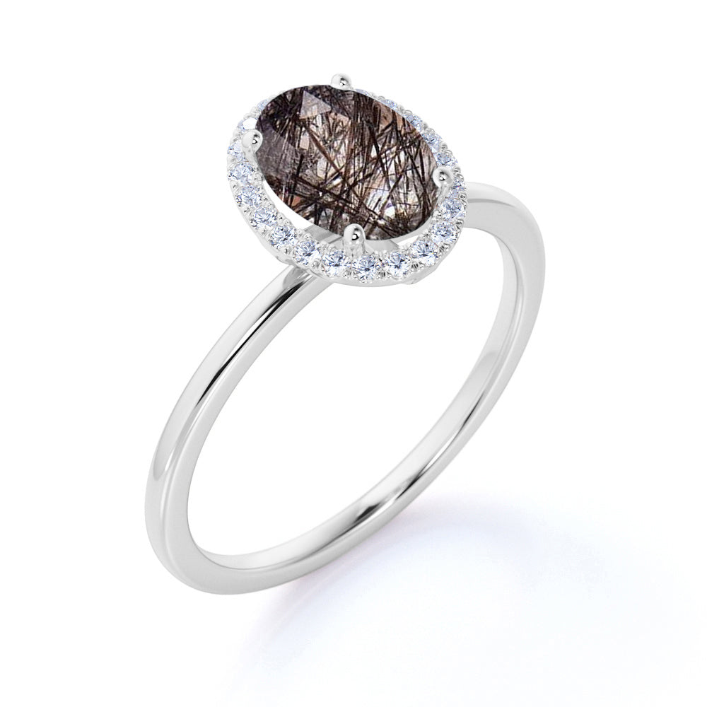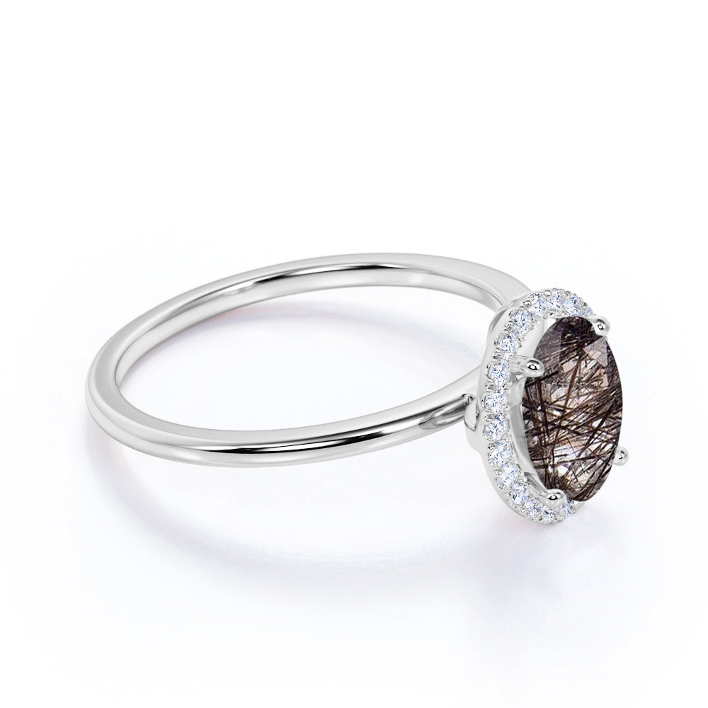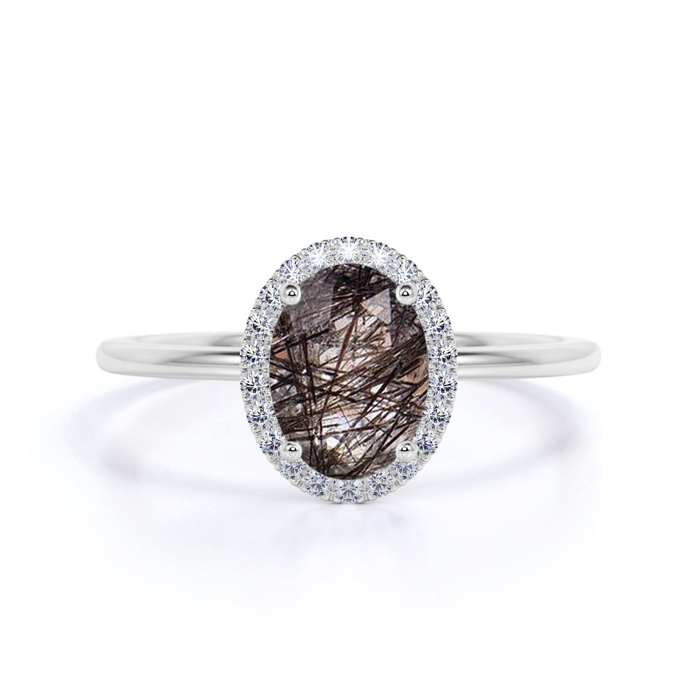 Modern Solitaire 1.25 Carat Oval Cut Natural Druzy Black Brown Rutilated Quartz and Diamond Halo Engagement Ring
