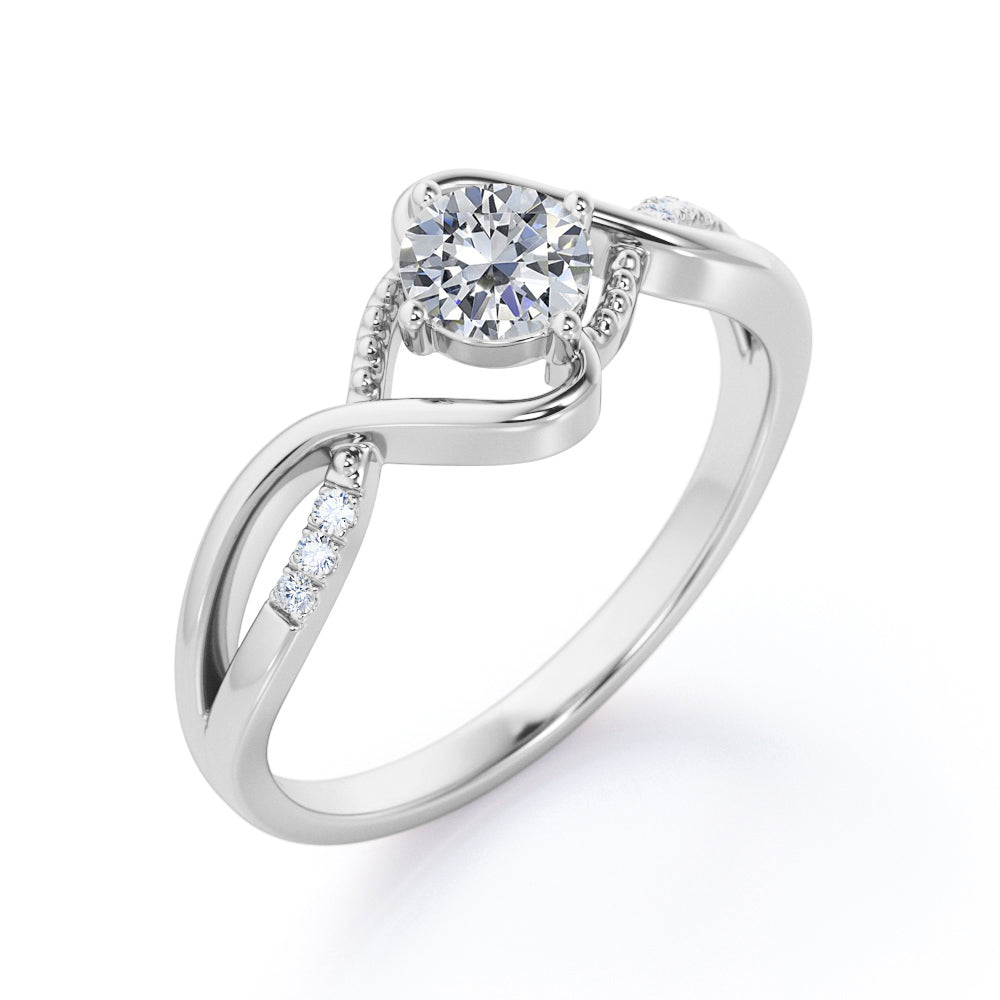Be fashionable with the Modern Twisted 0.55 carat Round Moissanite and Diamond Infinity Engagement Ring in Rose Gold. The promise ring showcases a 0.5 carat round cut of Moissanite that is connected to a split shank band and illustrates a double crossed heart in the middle. The band is twisted into No. 8, or the infinity symbol. It is a sign to show the love of your life that you want to spend the rest of your life with them. On the band, featured a Milgrain decoration with paved Moissanite to add some playfulness to the ring. It can be made in 18k gold over silver, 10k gold, 14k gold with the color of white gold, rose gold, yellow gold, black gold.