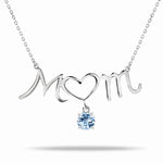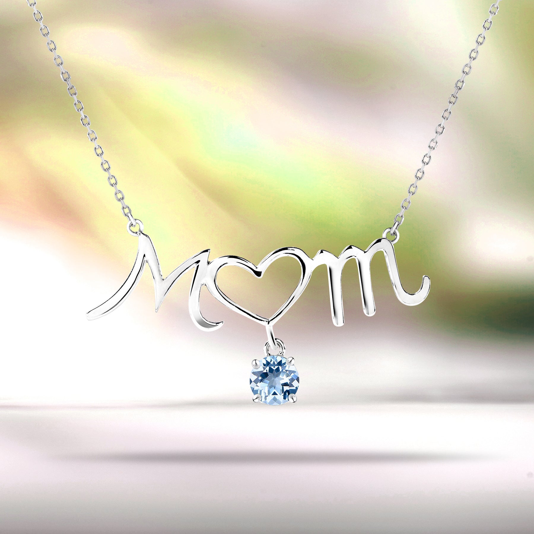 The Mom Heart-Shaped O with Hanging Ice Blue Stone Pendant Necklace in 18K White Gold over Silver - March Birthstone - Necklace for Mom is a stunning tribute to the unconditional love of motherhood. Crafted with exquisite attention to detail, this mom pendant silver necklace features the word MOM with a heart-shaped O. To add a touch of style, the pendant also features a round-cut red cubic zirconia, the birthstone for March, hanging from the heart. This element will make a perfect mother's day jewelry gift born in this special month or those who cherish the significance of their child's birthstone. This personalized mom jewelry necklace is more than just jewelry; it's a symbol of the everlasting bond between a mother and her child.