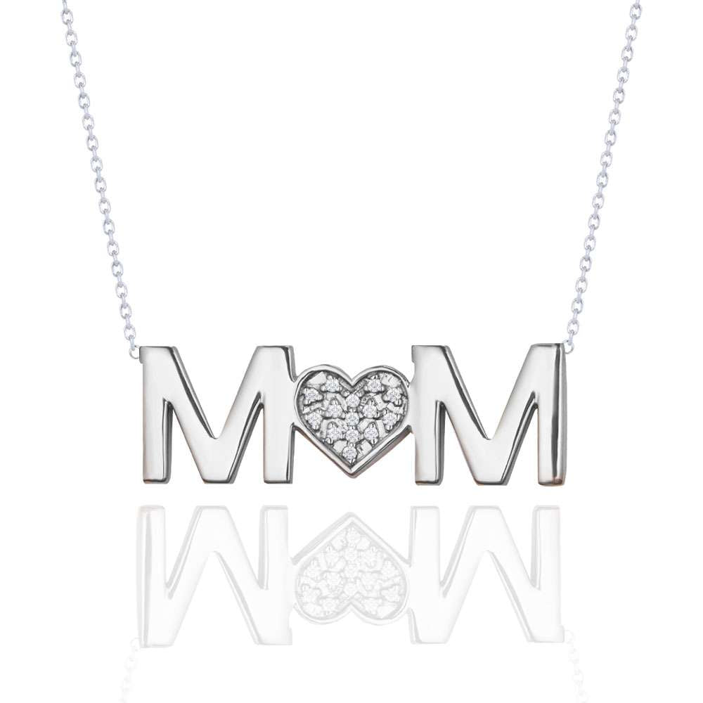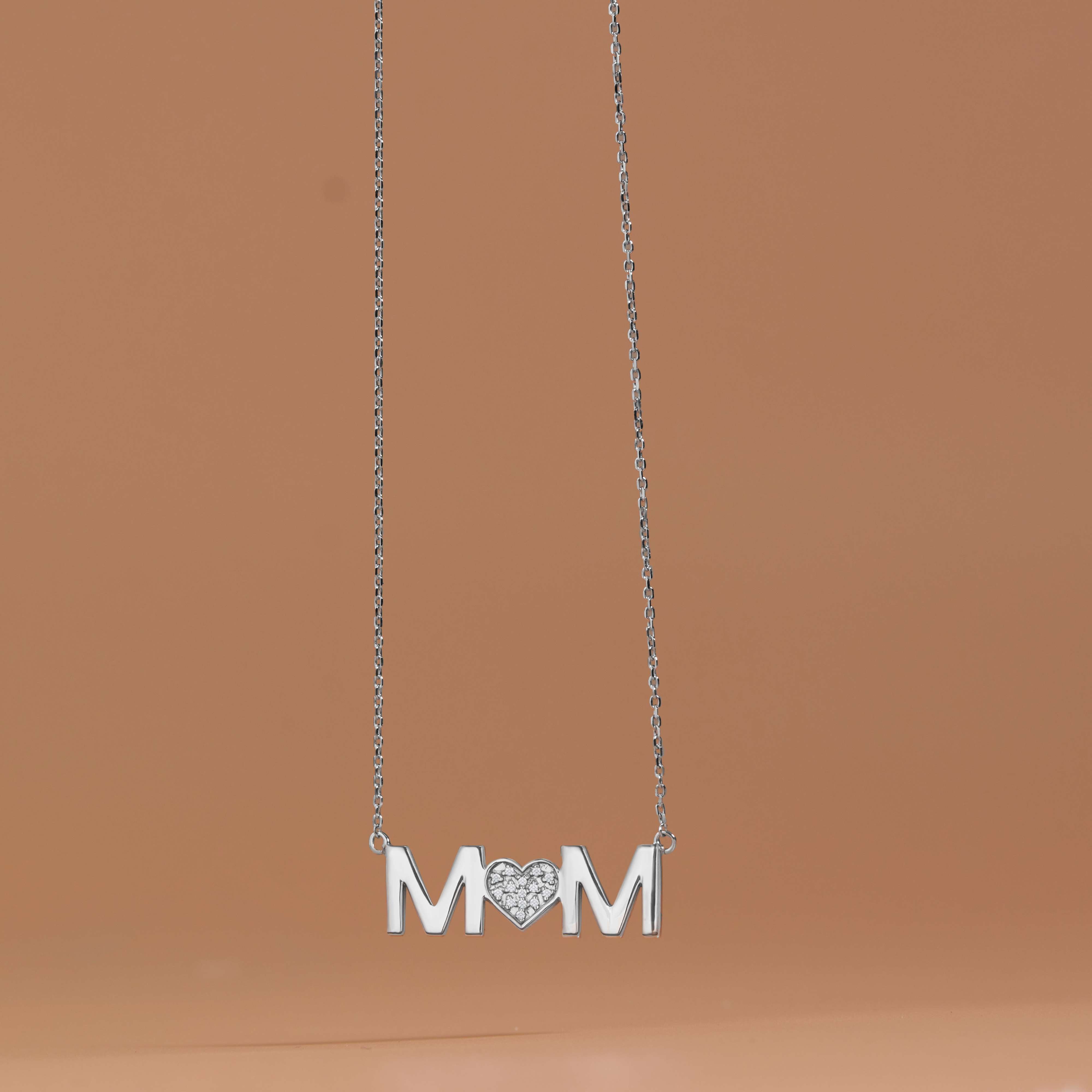 MOM Pendant Necklace - Moissanite Stone - April Birthstone in 18K White Gold over Sterling Silver