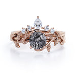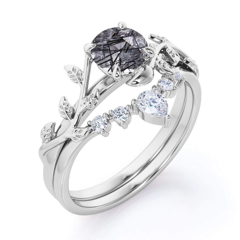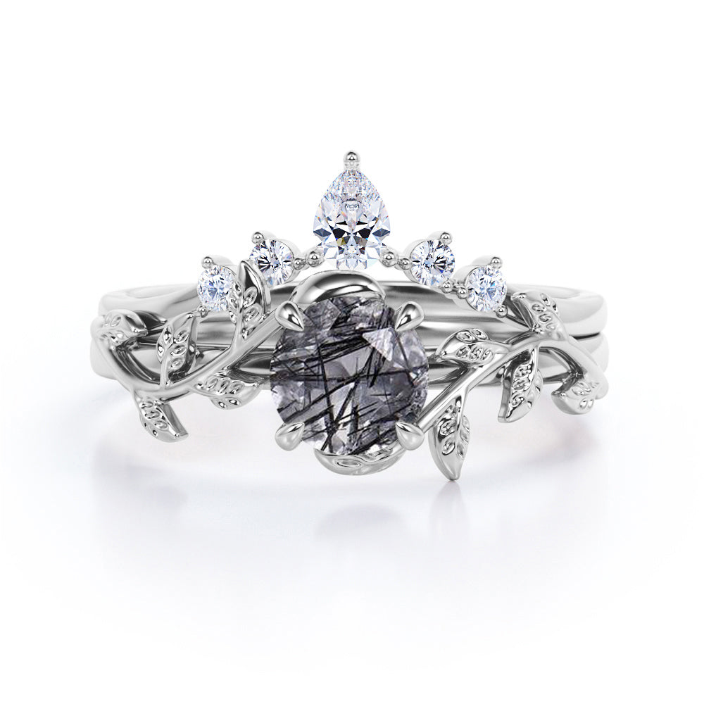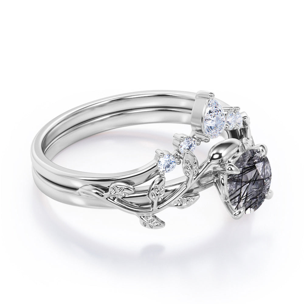 Nature Inspired 1.15 Carat Round Cut Solid Black Rutile Clear Crystal Quartz Leaf Style Five Stone Wedding Ring Set In White Gold. If you want to put a slight twist on a traditional wedding ring, a floral ring may be the perfect option for you. This ultra-feminine ring style is elegant, romantic, and timeless with a slightly vintage look that makes it stand out in a crowd. Inspired by nature, this charming ring is intricately carved and crafted into delicate leaf and vines that run flawlessly along the fingers. This floral pattern bridal set features one engagement ring with 1 carat black rutilate quartz center stone and 0.15 carat white sparkling five white diamonds on the matching wedding band. The sharp four claws holds the center stone allowing it to radiate its deep jewel tones.Take the natural feeling of a black rutilated quartz wedding ring to the next level with a botanical-inspired setting of gilded twigs and leaves. Handmade with love and care by our experienced craftsmen, this nature inspired 1.15 carat round cut solid black rutile clear crystal quartz leaf style five stone wedding ring set in white gold can also be customized to 18k Gold plating over silver, 10k Gold or 14k Gold as you desire.