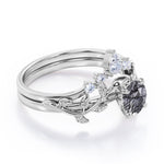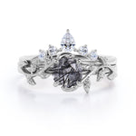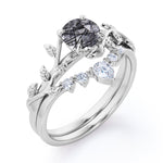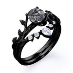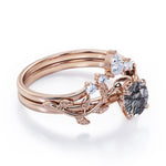 Nature Inspired 1.15 Carat Round Cut Solid Black Rutile Clear Crystal Quartz Leaf Style Five Stone Wedding Ring Set In White Gold