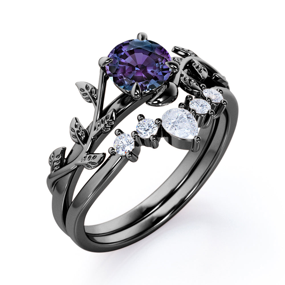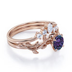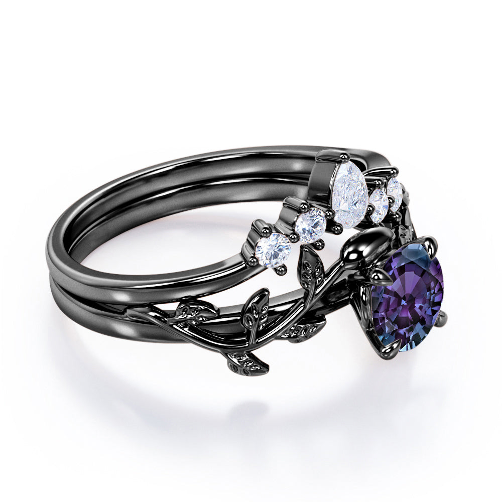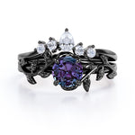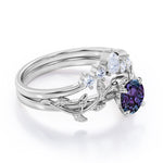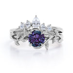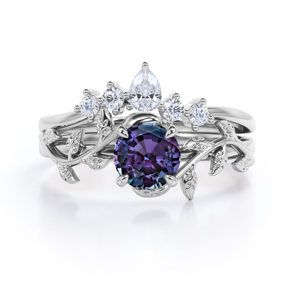 Nature Inspired 1.20 Carat Round Cut Lab Created Alexandrite And Diamond Leaf Vine Art Wedding Ring Set In White Gold For Her