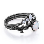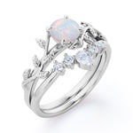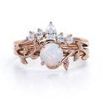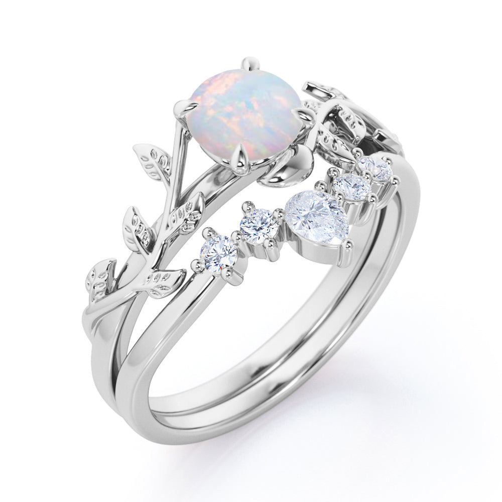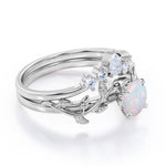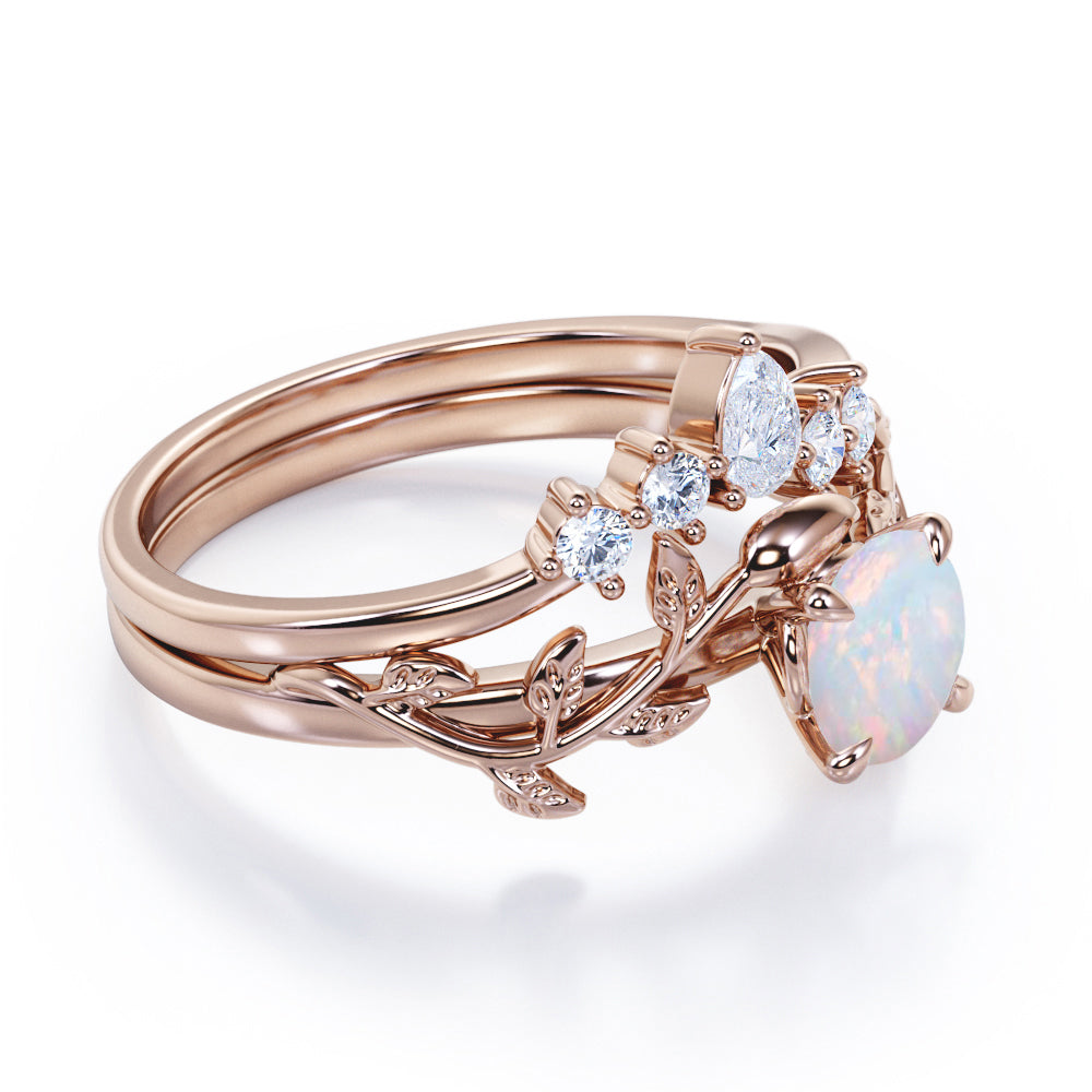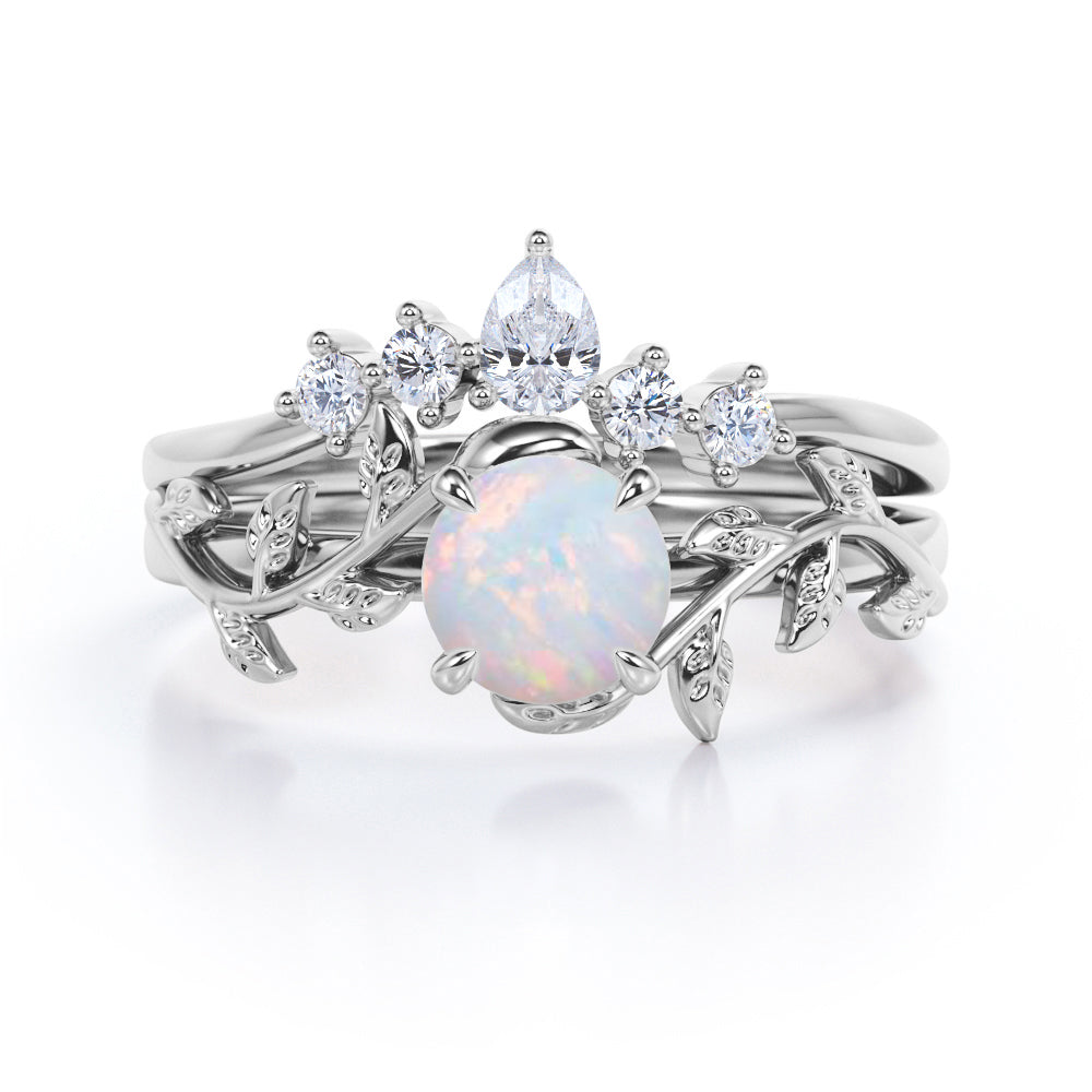 Nature Inspired 1.20 Carat Round Cut White Fire Opal And Diamond Leaf Vine Art Wedding Ring Set In White Gold For Her