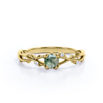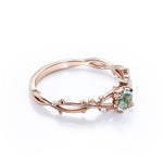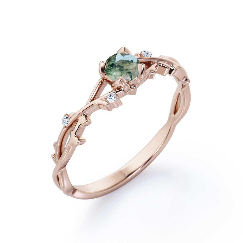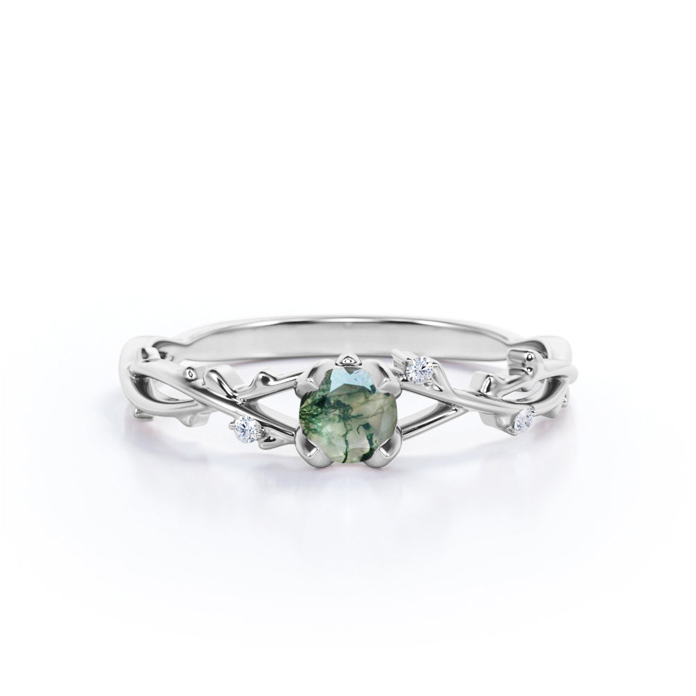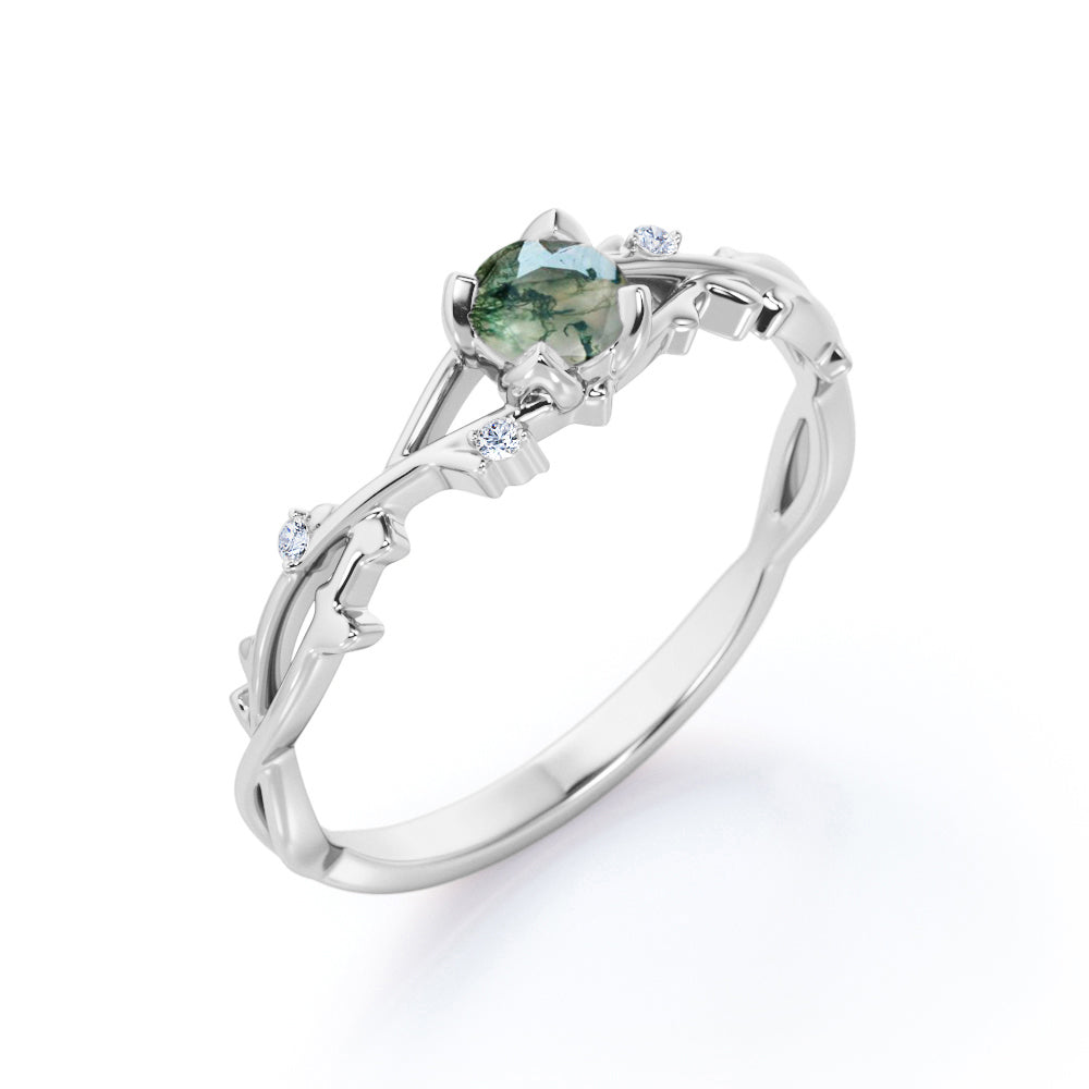Nature-Inspired Infinity 0.55 carat Round Moss Agate and Moissanite Engagement Ring in White Gold showcases a 0.5 carat round moss agate that is secured in decorative prongs; the prongs are crafted artfully in leaf form which connects the design with its split shank. The twisted band illustrates a sign of forever and represents your endless love to her. Round dainty Moissanite stones are scattered on the band and add a little shimmer to the band. This promise ring is available at a reasonable price and you can be sure that you will receive an unique authentic green agate ring. The color can be selected in either white gold, rose gold, yellow gold and black gold with the metal options of 18k gold over silver, 10k gold, 14k gold.