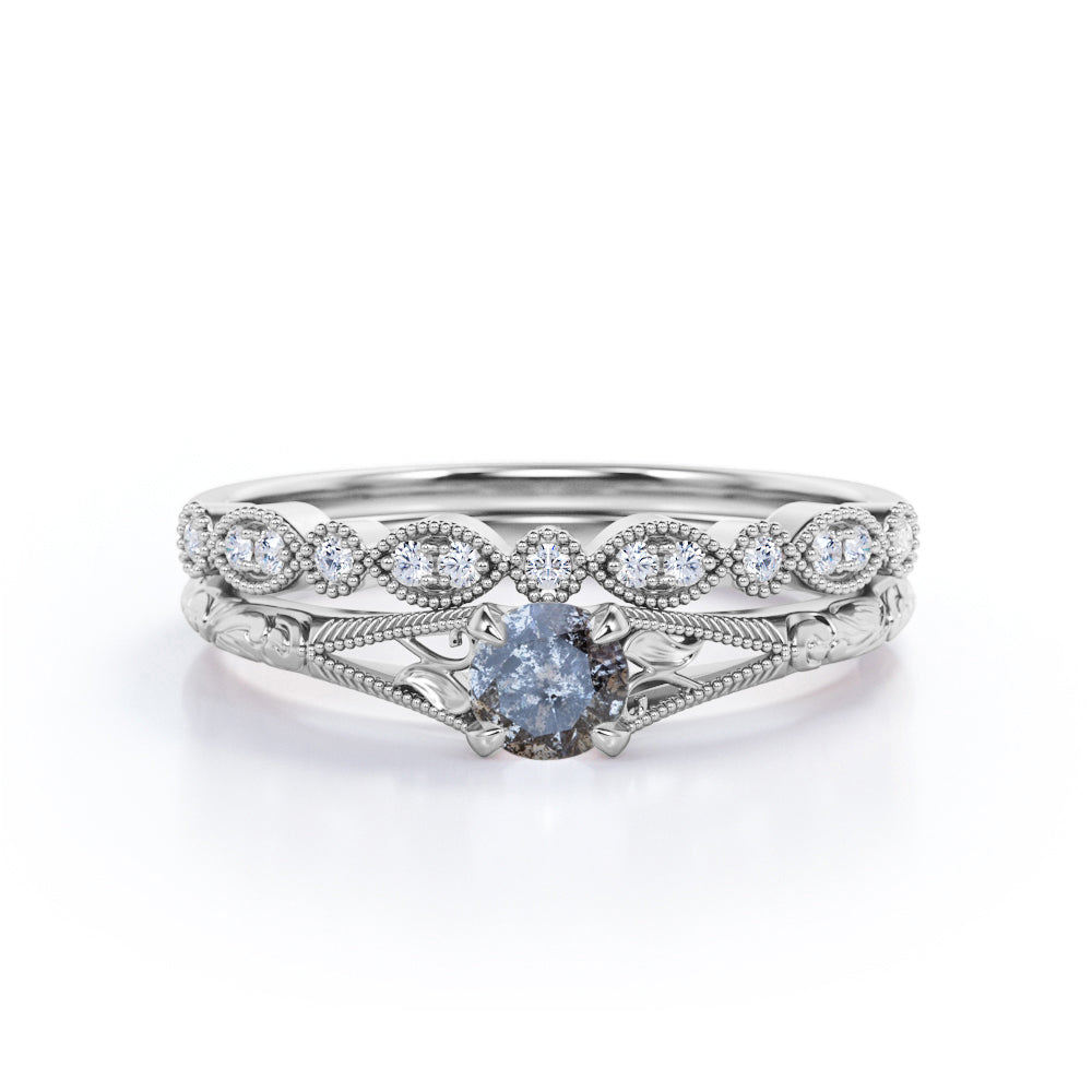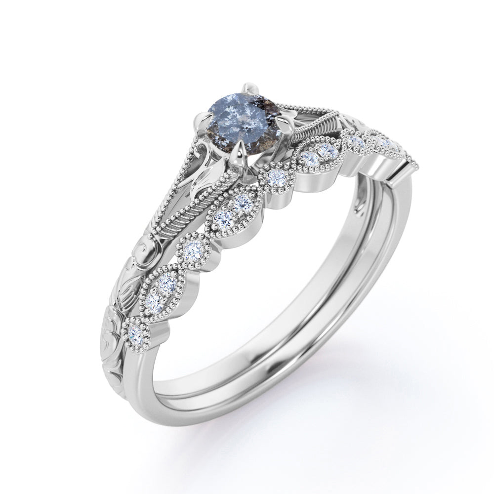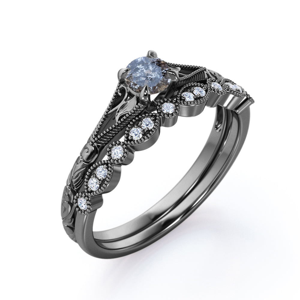 IMPORTANT NOTE: Since each Salt and Pepper Diamonds is one of a kind, the actual color of it may vary from the one that is pictured above. Embellish your love story with the uniqueness of this Nature Inspired Leaf Design .75 Carat Round Cut Natural Galaxy Black Grey Salt and Pepper Diamond Solitaire with Art Deco Band Wedding Ring Sets for Women. This leaf inspired style icy grey Salt and Pepper Diamond ring features .50 carat round cut natural Salt and Pepper Diamond and .25 carat real side diamond for gold ring and moissanite for silver ring. This elegant art deco wedding set rings can be customized to either 10k, 14K and Gold over Silver and either Black Gold, Rose Gold, White Gold or Yellow Gold. Also, as your satisfaction is our most priority, we will do our best to have your handmade jewelry be carefully and beautifully crafted by our expert jewelers. The order also comes with a 30-day full refund policy. Perfect for any occasion, this flawless natural Salt and Pepper Diamond ring can be an ideal gift for anniversary, birthday, proposal, Christmas, Valentines, mother's day and more. With its unique appearance, this unique dark grey Salt and Pepper Diamond ring will create a charming and fascinating look on your fingers. Being imperfect diamond, this Salt and Pepper Diamond encourages couple to look past the flaws and focus on the love since no one is perfect. Ornament and distinguish your love story with the neat distribution of black and white inclusions of Salt and Pepper Diamond. Salt and Pepper Diamonds suit a variety of ring styles and easily adapted to suit any type of fashion sense. With its especial color ranging from silky grays to stormy almost blacks, no two Salt and Pepper Diamond rings are alike. If you are in search of a unique gift for any occasion, this stunning Salt and Pepper Diamond ring is the best answer for you. This antique ring is available at a very affordable price yet it offers a very expensive and gorgeous look on your finger. Those who has a penchant for vintage and flawless ring would completely fall in love with this affordable ring. With its mesmerizing salt and pepper inclusions, it is sure to enchant your special someone with gracefulness.