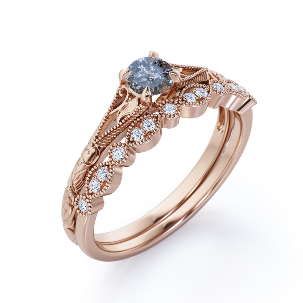 Leaf 0.75 Ct Round Salt and Pepper Diamond Wedding Ring Set