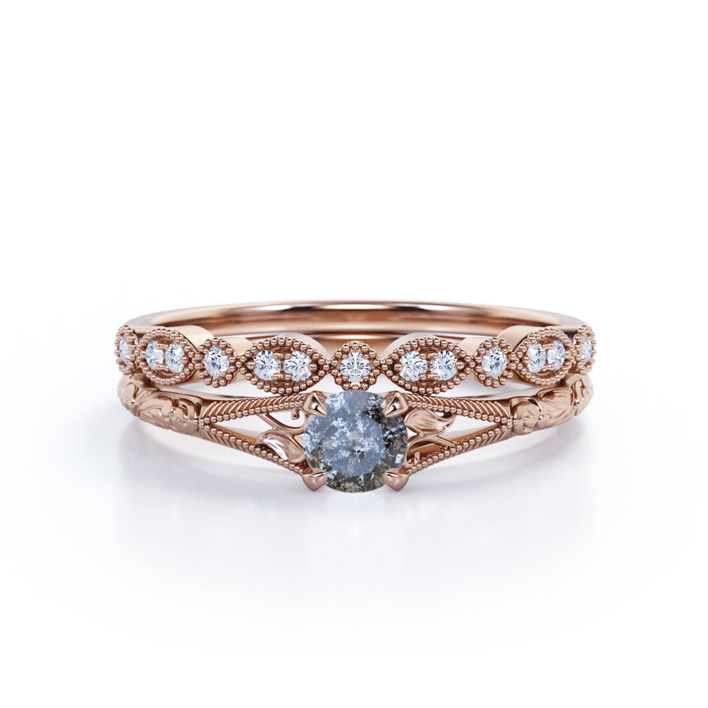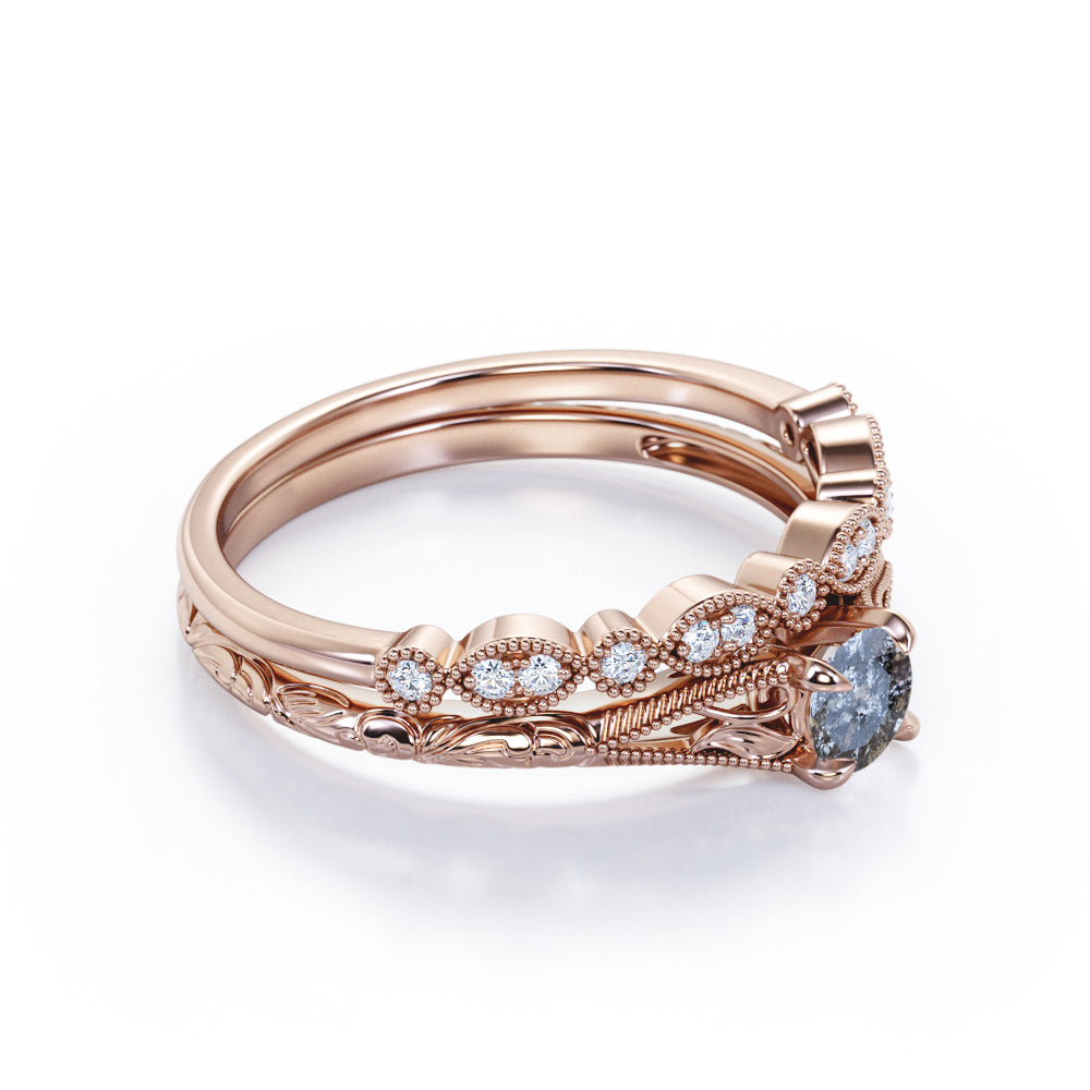 Leaf 0.75 Ct Round Salt and Pepper Diamond Wedding Ring Set