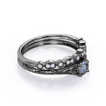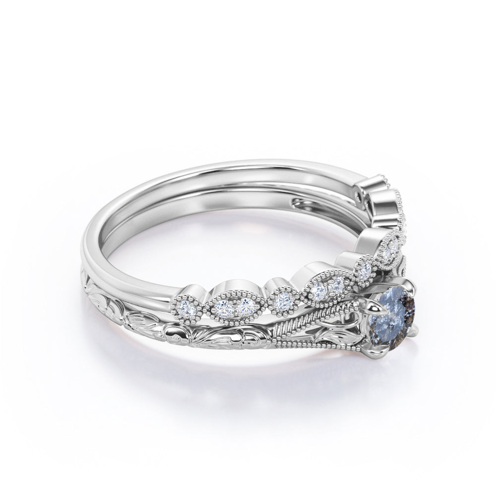 IMPORTANT NOTE: Since each Salt and Pepper Diamonds is one of a kind, the actual color of it may vary from the one that is pictured above. Embellish your love story with the uniqueness of this Nature Inspired Leaf Design .75 Carat Round Cut Natural Galaxy Black Grey Salt and Pepper Diamond Solitaire with Art Deco Band Wedding Ring Sets for Women. This leaf inspired style icy grey Salt and Pepper Diamond ring features .50 carat round cut natural Salt and Pepper Diamond and .25 carat real side diamond for gold ring and moissanite for silver ring. This elegant art deco wedding set rings can be customized to either 10k, 14K and Gold over Silver and either Black Gold, Rose Gold, White Gold or Yellow Gold. Also, as your satisfaction is our most priority, we will do our best to have your handmade jewelry be carefully and beautifully crafted by our expert jewelers. The order also comes with a 30-day full refund policy. Perfect for any occasion, this flawless natural Salt and Pepper Diamond ring can be an ideal gift for anniversary, birthday, proposal, Christmas, Valentines, mother's day and more. With its unique appearance, this unique dark grey Salt and Pepper Diamond ring will create a charming and fascinating look on your fingers. Being imperfect diamond, this Salt and Pepper Diamond encourages couple to look past the flaws and focus on the love since no one is perfect. Ornament and distinguish your love story with the neat distribution of black and white inclusions of Salt and Pepper Diamond. Salt and Pepper Diamonds suit a variety of ring styles and easily adapted to suit any type of fashion sense. With its especial color ranging from silky grays to stormy almost blacks, no two Salt and Pepper Diamond rings are alike. If you are in search of a unique gift for any occasion, this stunning Salt and Pepper Diamond ring is the best answer for you. This antique ring is available at a very affordable price yet it offers a very expensive and gorgeous look on your finger. Those who has a penchant for vintage and flawless ring would completely fall in love with this affordable ring. With its mesmerizing salt and pepper inclusions, it is sure to enchant your special someone with gracefulness.