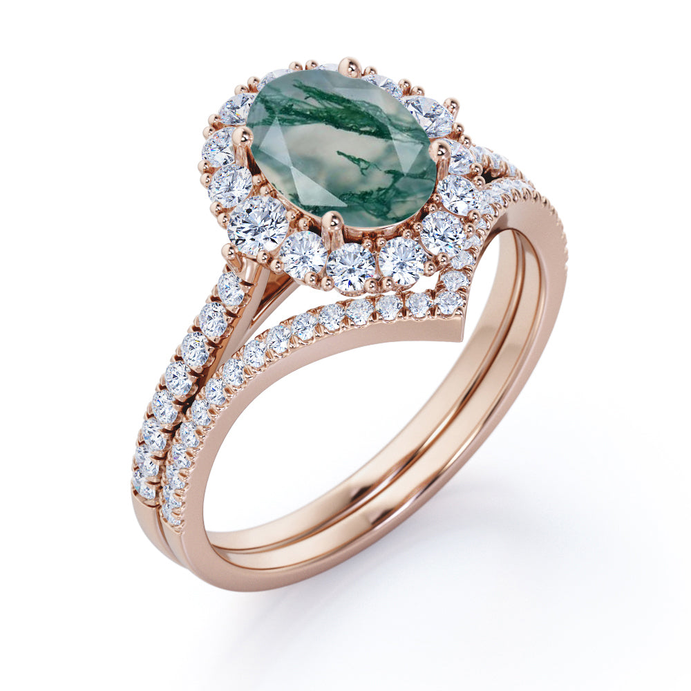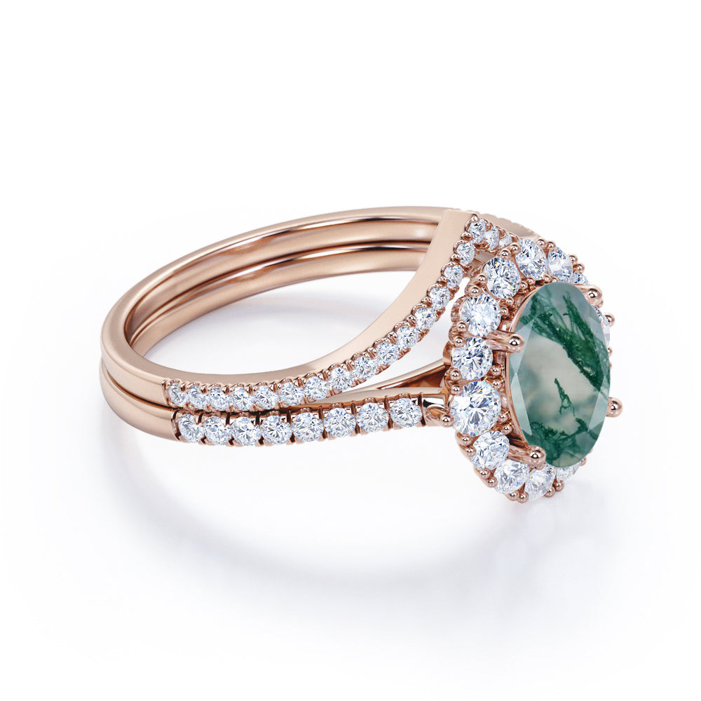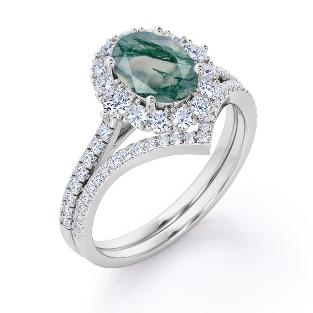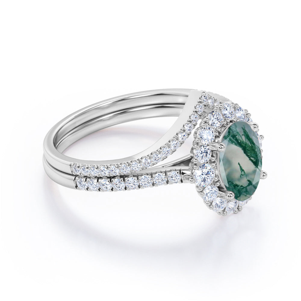 1.75 Carat Oval Cut Moss Agate Halo Bridal Set