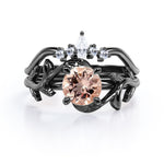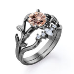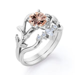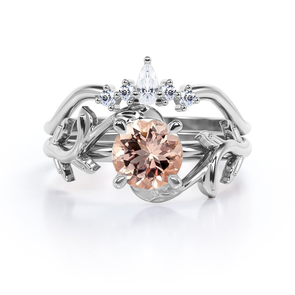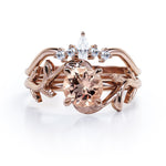 Nature Leaf 0.55 carat Round Morganite and Moissanite Crown Bridal Ring Set in Rose Gold