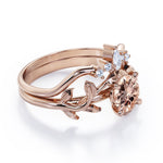Nature Leaf 0.55 carat Round Morganite and Moissanite Crown Bridal Ring Set in Rose Gold contains two design rings; one promise ring and one wedding band. A 1 carat round Morganite is placed on a nature-inspired engagement ring; it is held by the curvy vines that has dainty leaves decorated on it. Comes with the morganite ring is a contoured wedding band that features 5 stones on top of it; in the middle is a pear shape Morganite follow by two round Moissanite on each side. A brilliance from Moissanite adds some sparkle to the wedding set. They compliment each other once they are worn together but wearing them separately is also a nice option since you can match it with any other jewelry or outfit. Perfect for all occasion and is lovely as a gift. Both rings can be made in 18k gold over silver, 10k gold and 14k gold with the color options of white gold, rose gold, send black gold.