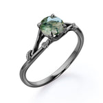 Twig but not twisted. The Nature lover's choice - 0.75 carat Round Moss agate Leaf Promise Ring in White Gold features 0.75 carat authentic moss agate. Split shanks are delicately polished and crafted in to leaf and vines design. The 2 bands are contoured and illustrate a connection between each other, which if you look from afar, you will see that green moss agate is held in branches that linked and formed into marquise shape like a heart of the forest. Moss agate is a healing stone that will restore a good force to you, it wipes out the bad energy and refresh it. Green color is embed within the stone and whenever you look at it, it will calm you and sooth your soul. Moss agate jewelry is a very popular jewelry because Moss Agate is also a stone of wealth and it attracts abundance in all forms so it a perfect choice for all people at all ages. Our natural Moss agate engagement ring is available at a very reasonable price and it can be customized in to 18k gold over silver, 10k gold, 14k gold, 18k gold and in the colors of white gold, rose gold, yellow gold and black gold.