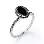 Start the greatest love story of your life with this North-South Halo - 1.5 TCW Oval Shape Lab Created Black Diamond - Pave Design Engagement Ring in White Gold. Professionally handcrafted into a fine oval cut by our experts in lapidary, this exceptional black diamond ring consists of total 1.5 carat lab created black diamond on solid white gold. Distinctive and extraordinary, this black diamond ring is well-suited for those who are not quite into normal lifestyle. With its charming color, this black diamond band will enhance happiness and attract positive vibes. This black diamond ring is beautiful and accessible since it is available at an affordable price. If you are in search of an incredibly romantic gift for your significant other, our synthetic black diamond ring, symbolically representing love, good fortune and creativity, will be the greatest choice you will ever make. Also, this black diamond stone ring can be customized, so customers can choose one of metal colors between white gold, rose gold, yellow gold or black gold in 10k and 14k gold metal options. Let's fulfill your love story with this black diamond engagement ring and, surely, she will not regret it.