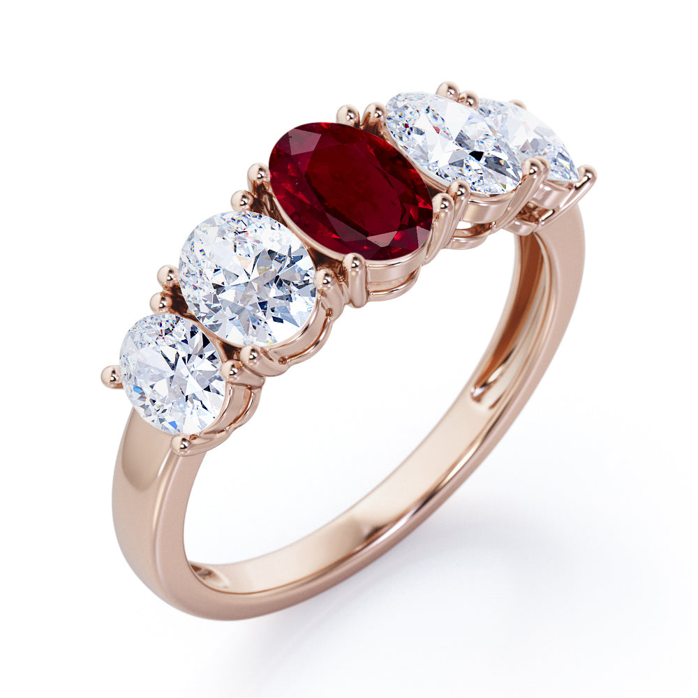 Make your special day more memorable with the sparkling Oval Basket Set 1.25 carat Ruby and Moissanite Fine Jewelry Ring in White Gold. This promise ring can be an engagement ring or a luxurious gift for your special someone. The ring boasts a 0.4 carat Oval Ruby in the center with four oval Moissanite stones in different sizes. The ring can glisten the look either you are attending the glam party or going out to shopping. It comes with 3 metal options; 18k gold over silver, 10k gold and 14k gold with 4 colors that you can choose; white gold, rose gold, yellow gold and black gold.
