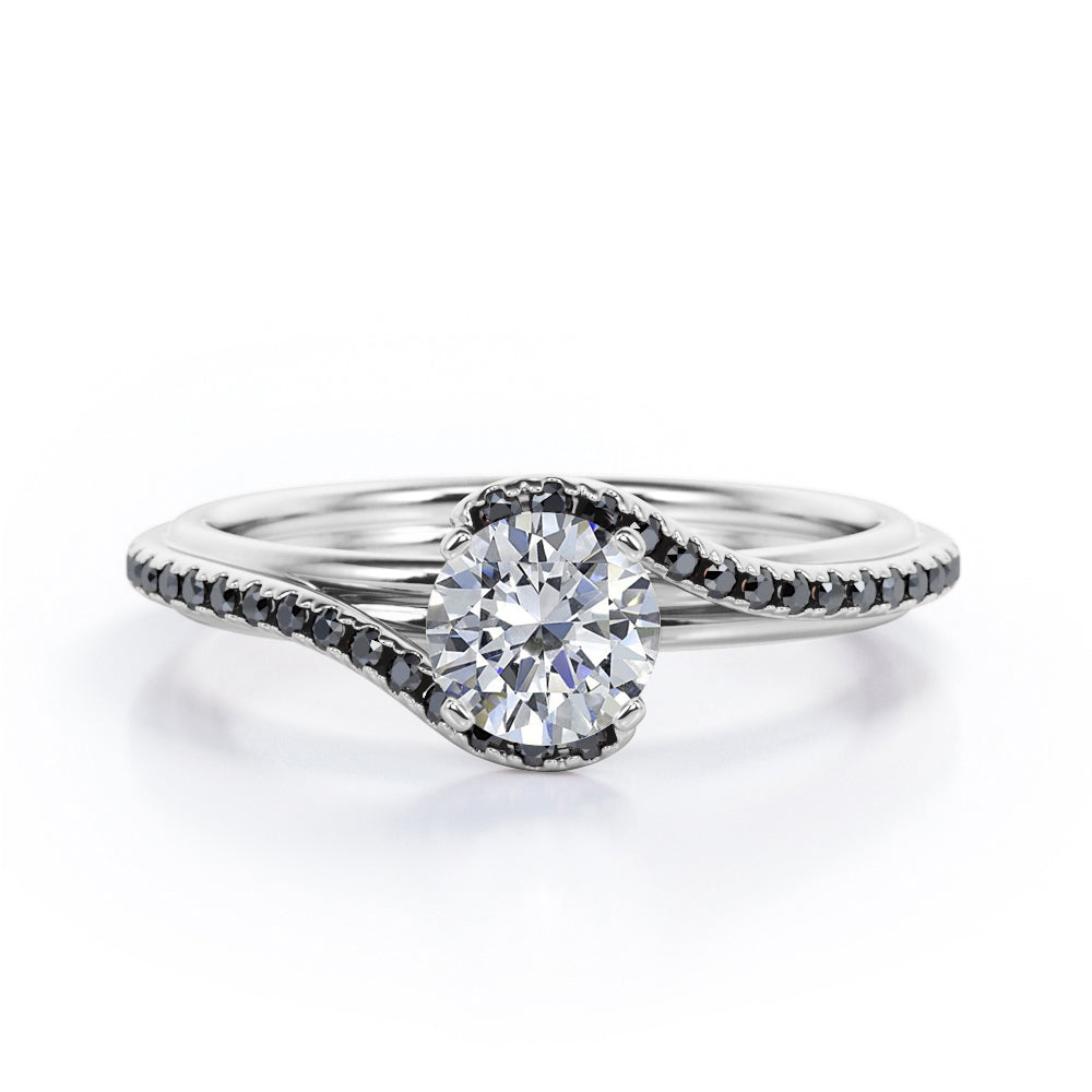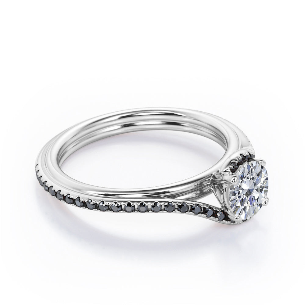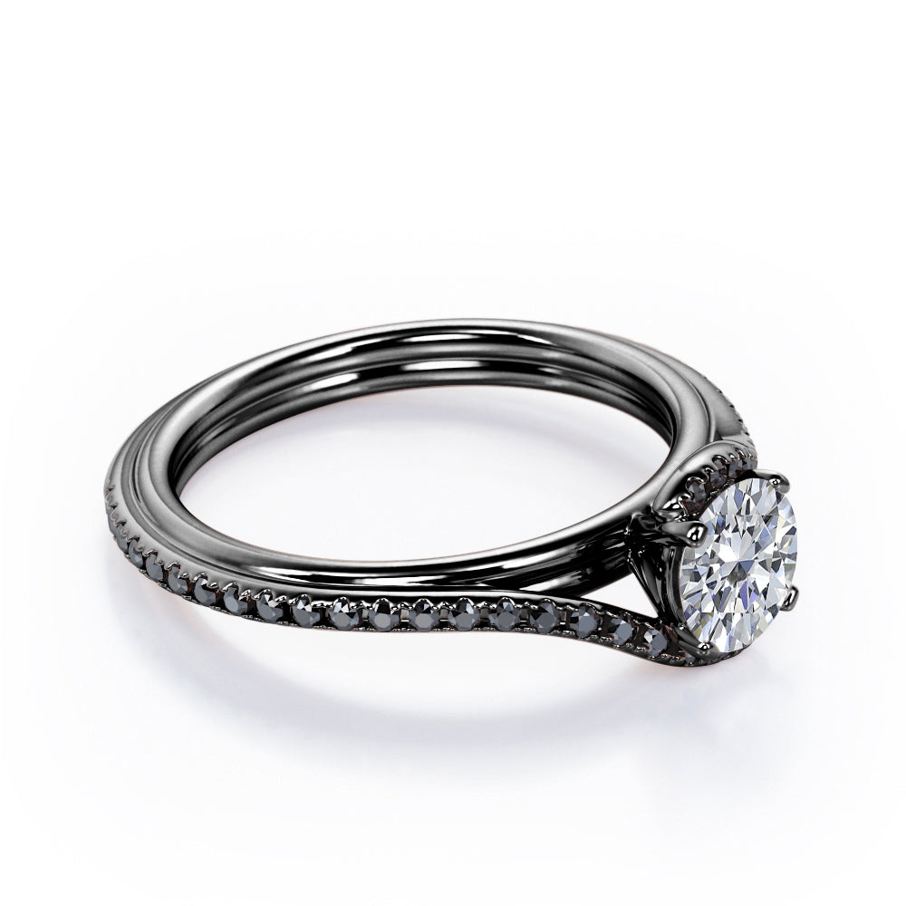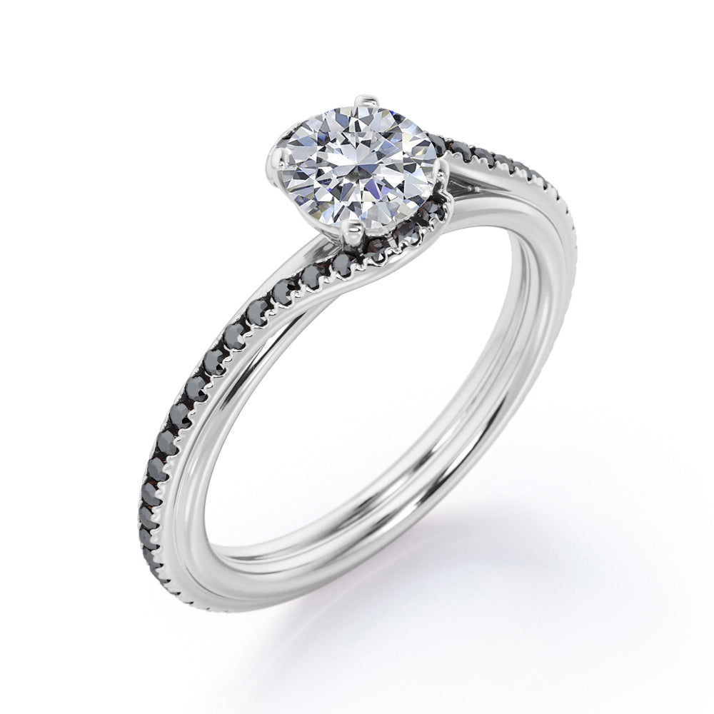 With this Overlay Double Banded - 1.25 TCW Round Cut Moissanite with Lab Created Black diamond - Tension Pave Engagement Ring in White gold, you can begin the most romantic chapter of your life. Hand-cut with deftness into a lovely shape round cut by our lapidary expertise, this elegant Moissanite wedding ring comprises total 1.25 carat Moissanite with lab-created Black diamond side stones on solid white gold. Distinct and unusual, this inexpensive engagement ring is ideal for those who wish to express their charisma and uniqueness. with its dazzling beauty, this Moissanite wedding ring for women will accentuate any outfit the wearer chooses to put on. Beautiful and affordable, this affordable wedding ring is a great choice for any woman's jewelry collection. If you are looking for a Moissanite ring for any special event, such as a birthday, an engagement, or a marriage proposal, this inexpensive engagement ring a great choice. Additionally, this affordable Moissanite ring can be customized, so customers can choose one of metal colors between White gold, rose gold, yellow gold and black gold in 18k Gold over Silver, 10k and 14k gold metal options. Let's show her how much you care by giving her this gold band with Moissanites, and she will never regret it.
