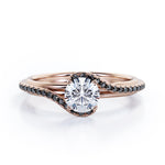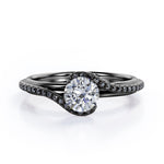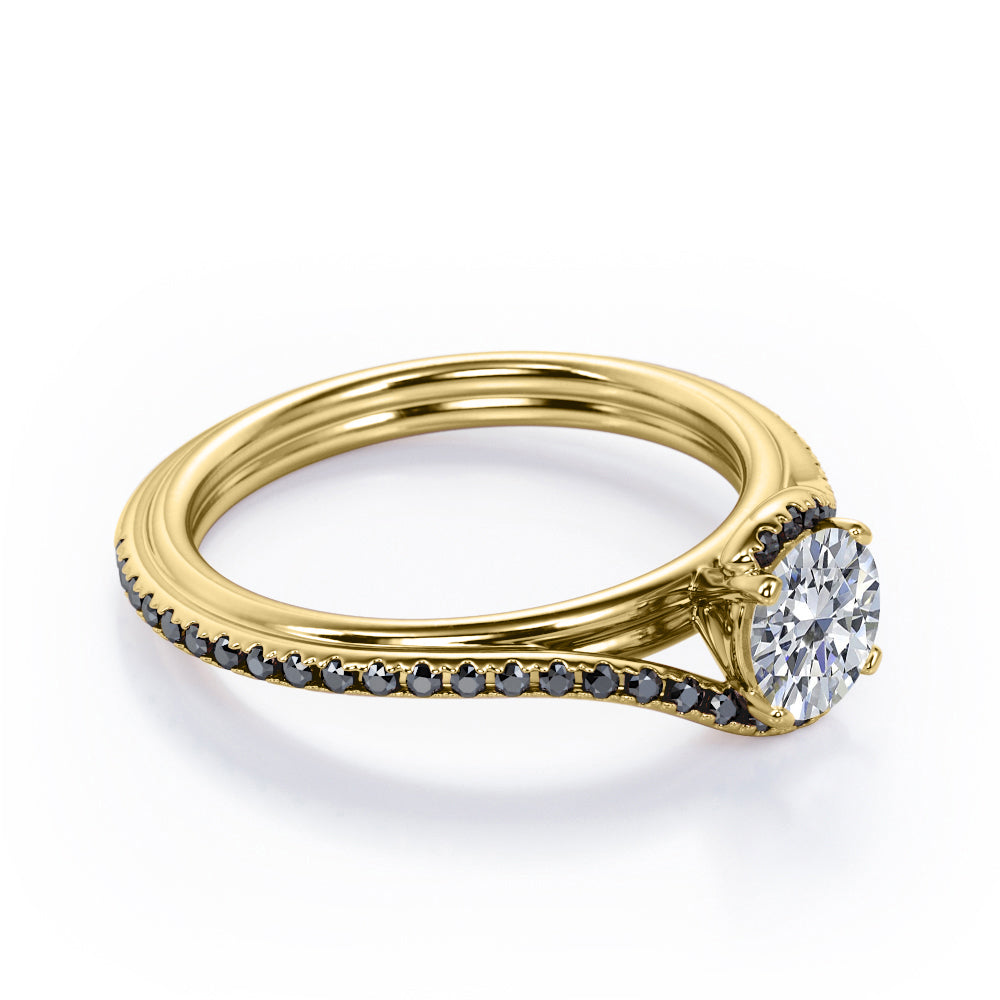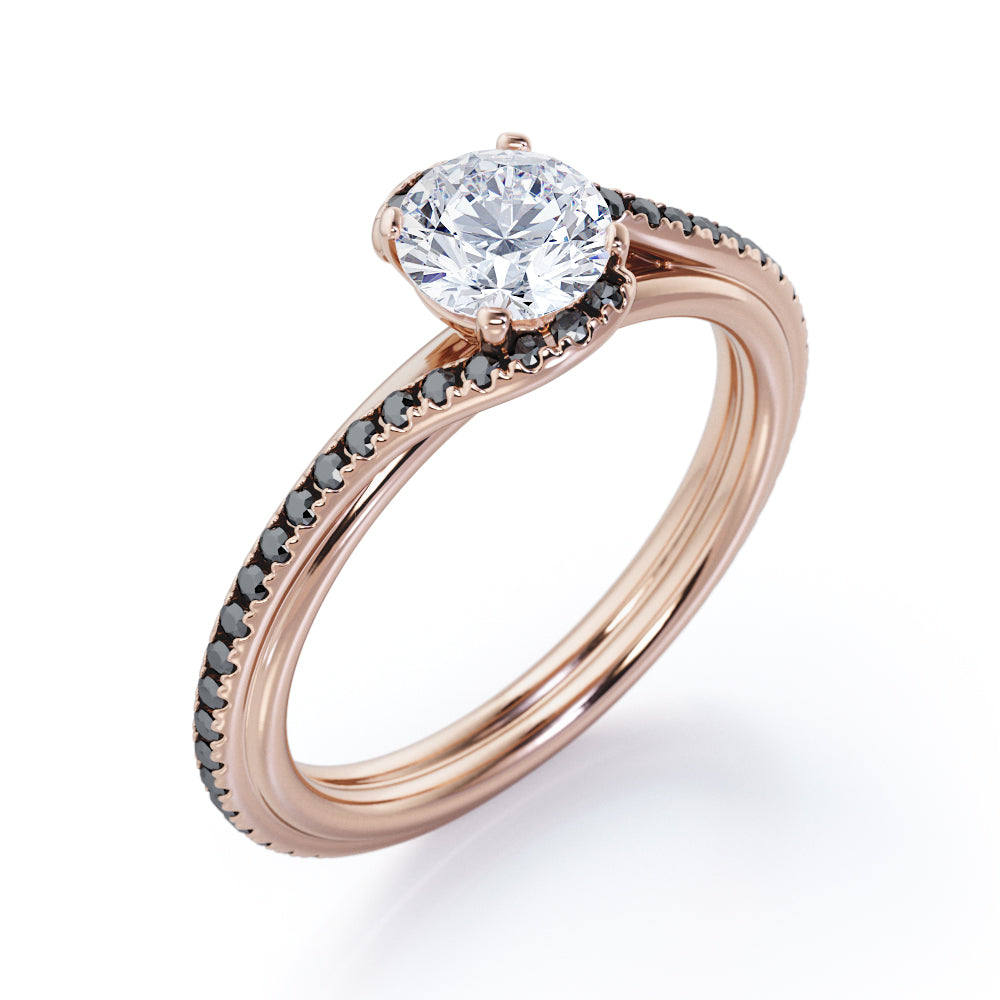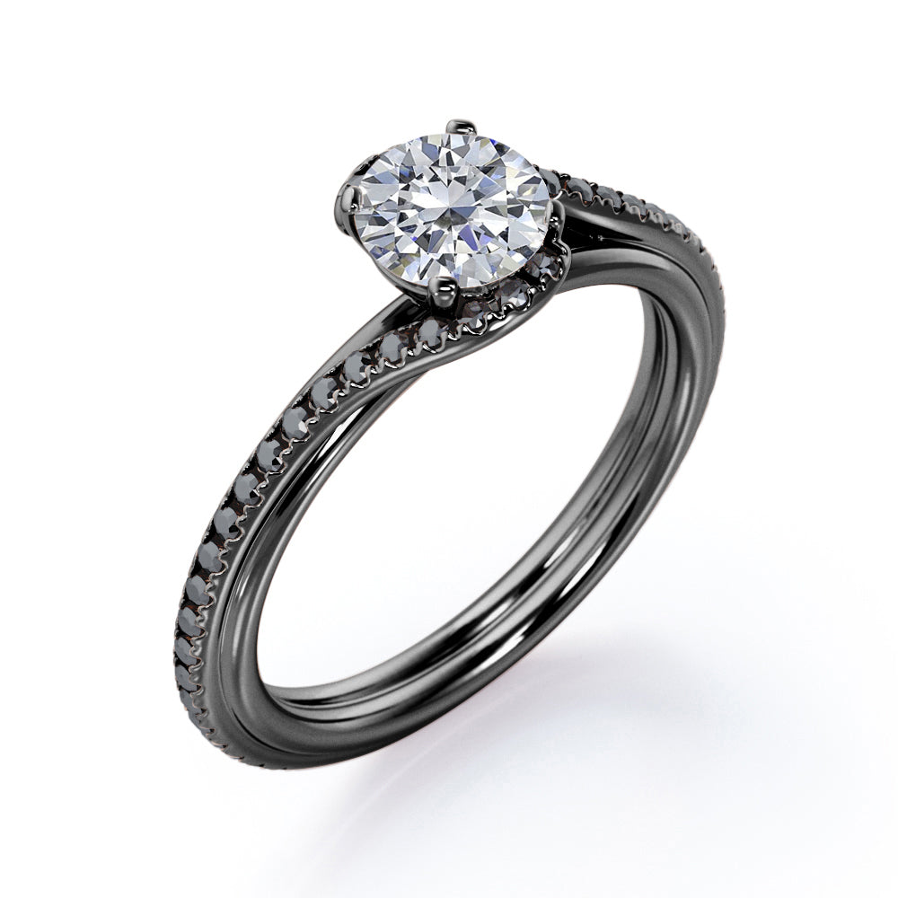 With this Overlay Double Banded - 1.25 TCW Round Cut Moissanite with Lab Created Black diamond - Tension Pave Engagement Ring in White gold, you can begin the most romantic chapter of your life. Hand-cut with deftness into a lovely shape round cut by our lapidary expertise, this elegant Moissanite wedding ring comprises total 1.25 carat Moissanite with lab-created Black diamond side stones on solid white gold. Distinct and unusual, this inexpensive engagement ring is ideal for those who wish to express their charisma and uniqueness. with its dazzling beauty, this Moissanite wedding ring for women will accentuate any outfit the wearer chooses to put on. Beautiful and affordable, this affordable wedding ring is a great choice for any woman's jewelry collection. If you are looking for a Moissanite ring for any special event, such as a birthday, an engagement, or a marriage proposal, this inexpensive engagement ring a great choice. Additionally, this affordable Moissanite ring can be customized, so customers can choose one of metal colors between White gold, rose gold, yellow gold and black gold in 18k Gold over Silver, 10k and 14k gold metal options. Let's show her how much you care by giving her this gold band with Moissanites, and she will never regret it.