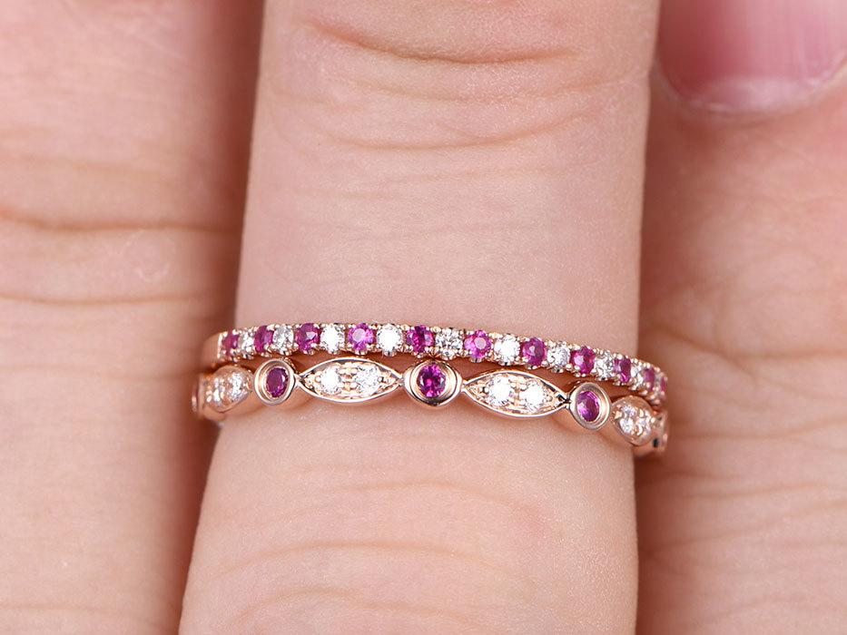 Pair of .50 Carat Round cut Ruby Diamond Wedding Ring Band Art Deco in Rose Gold
