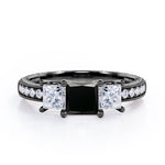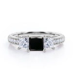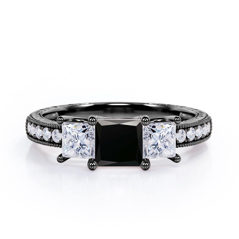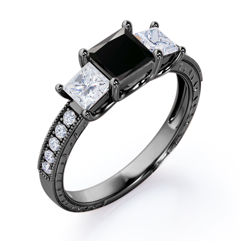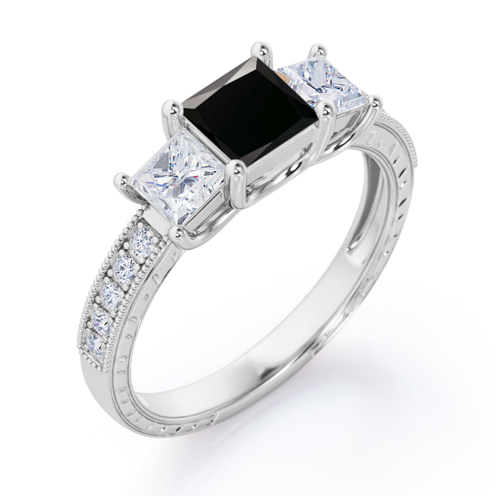 Past, Present and Future 1.25 Carat Princess Cut lab created Black Diamond Vintage Milgrain Engagement Ring In White Gold. Timeless and sophisticated, this feminine ring will never go out of style. You're not missing out on any sparkle with this three-stone engagement ring. Featuring a row of princess cut diamonds on a white gold band, we love the stunning brilliance that this piece exudes. Nothing exudes royalty like a row of three princess-cut diamonds on a vintage milgrain band. Featuring 1 carat center black diamond and 0.25 carat side white diamonds, this piece is clean, striking, and sophisticated. Sometimes feelings can be difficult to put into words, but the ideal engagement ring can speak for you since it will evoke feelings of delight that will last a lifetime. The vintage milgrain style surely makes it one of a kind of ring that can grab the attention of anyone around. This past, present and future 1.25 carat princess cut black diamond vintage milgrain engagement ring in white gold can also be customized to 10k Gold or 14k Gold as per your choice.