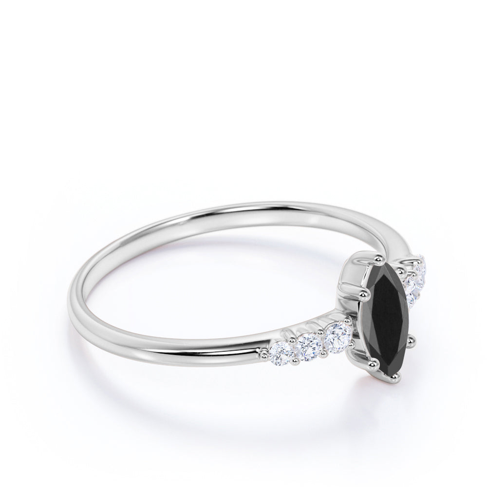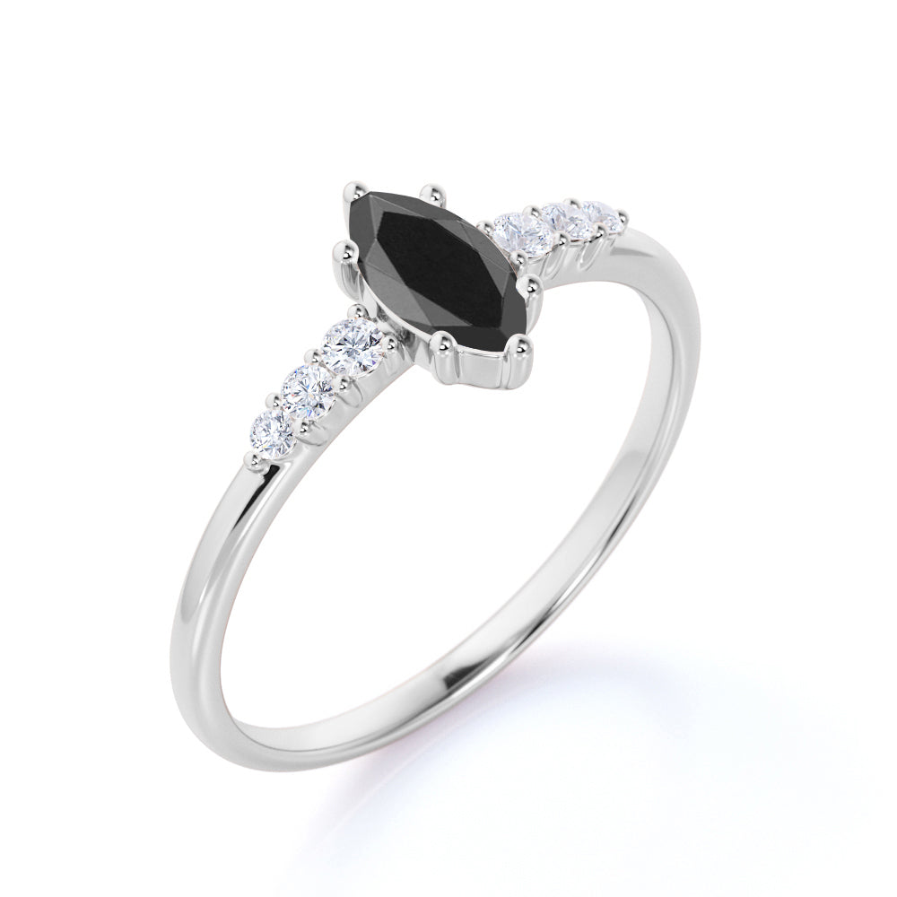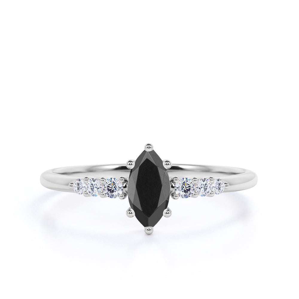 Perfect for any occasion, birthday gift, anniversary gift, promise ring or just a simple gift for your loved ones. If you don't want a modern black diamond ring, this classic black diamond ring is the best for you. It reminisce your past and those times when you and her are still young lovers. This black diamond ring features an approximately 1.50 carat marquise cut lab created black diamond, surrounded by .25 carat natural side diamonds, for a total weight of 1.75 carats.