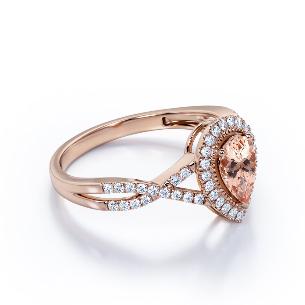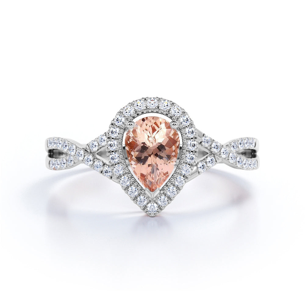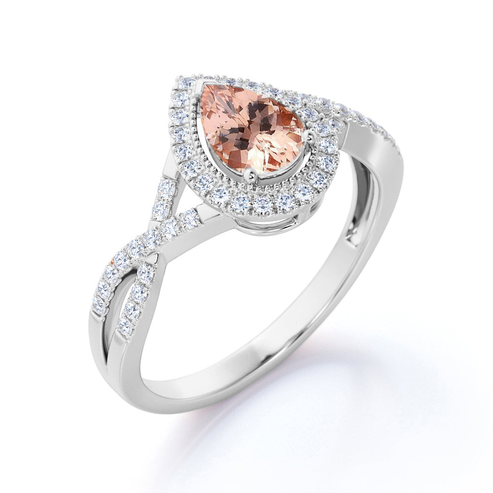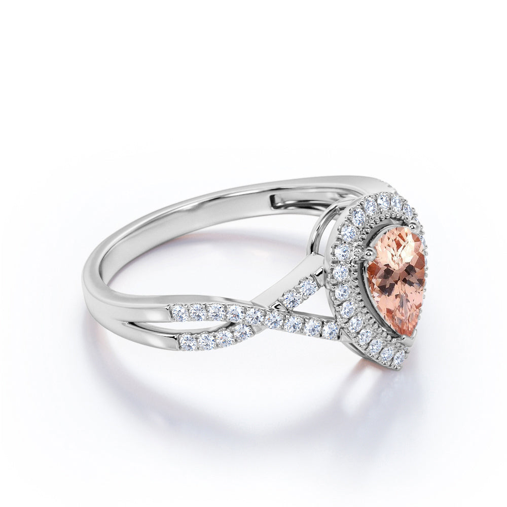 Pave 1.75 Carat Pear Cut Peach Morganite and Diamond Vintage Engagement Ring in White Gold