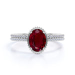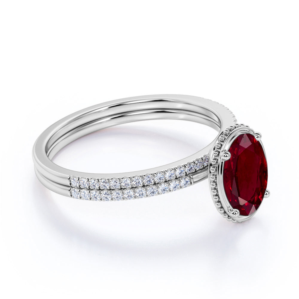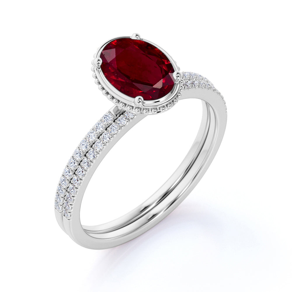 Pave 1.40 Carat Oval Cut Lab-Created Ruby and Diamond Wedding Set in White Gold
