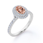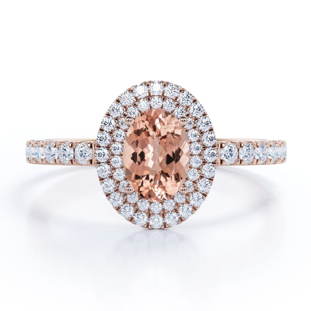Pave Accented Band 1.75 Carat Ovate created morganite and Moissanite Double Halo Engagement Ring in 18K Rose Gold Plating over Silver. Capture your eternal love with this Pave Accented Band 1.75 Carat Ovate Created Morganite and Moissanite Double Halo Engagement Ring in 18K Rose Gold Plating over Silver. Professionally handcrafted into a fine oval cut by our skilled jewelers, this appealing silver morganite ring is made up of 1 carat morganite and 0.75 carat side-stone moissanites on solid rose gold plating over silver. Special and non-traditional, this morganite stone ring is perfect for those who would love to express their charisma and uniqueness. With its charming color, this morganite stone ring will unquestionably be an essential additional to any jewelry collection. This morganite promise ring is beautiful and accessible since it is available at an affordable price. Considered as a symbol of eternal love and affection for your lover, this sterling silver morganite ring , symbolizing sweetness, romance, love, and innocence, will surely be the best choice. This morganite ring can be customized, either in 18K white gold plating over silver, or 18K rose gold plating over silver, upon customer request. Let's fulfill your love story with this silver morganite ring and she will be eternally joyful.