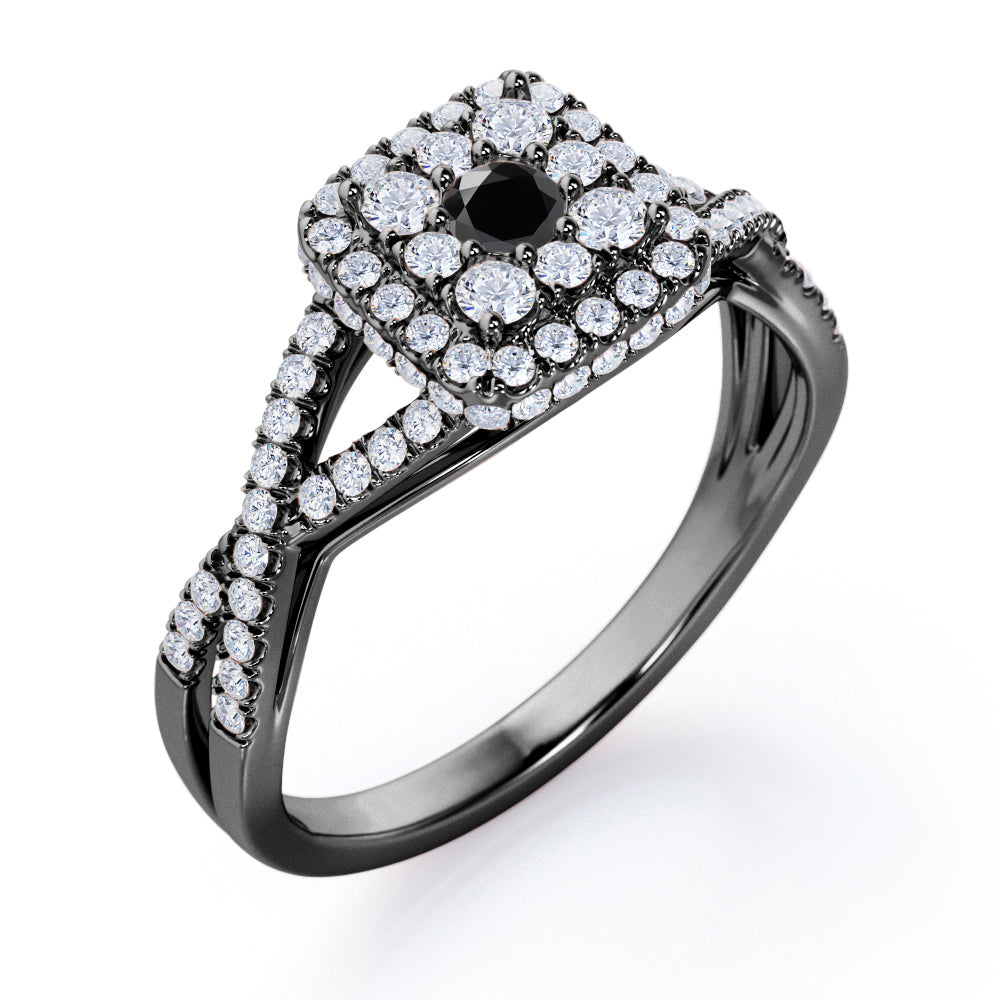 Pave Crossover - 1.25 Carat Round Cut Black Diamond - Flush Cluster Halo Engagement Ring in White Gold