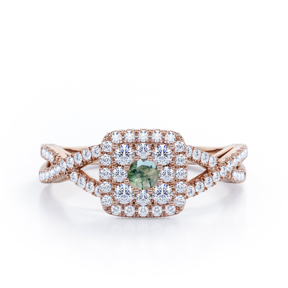 Pave Crossover - 1.25 Carat Round Cut Green Moss Agate and diamond - Flush Cluster Halo Engagement Ring in Rose Gold