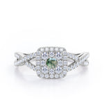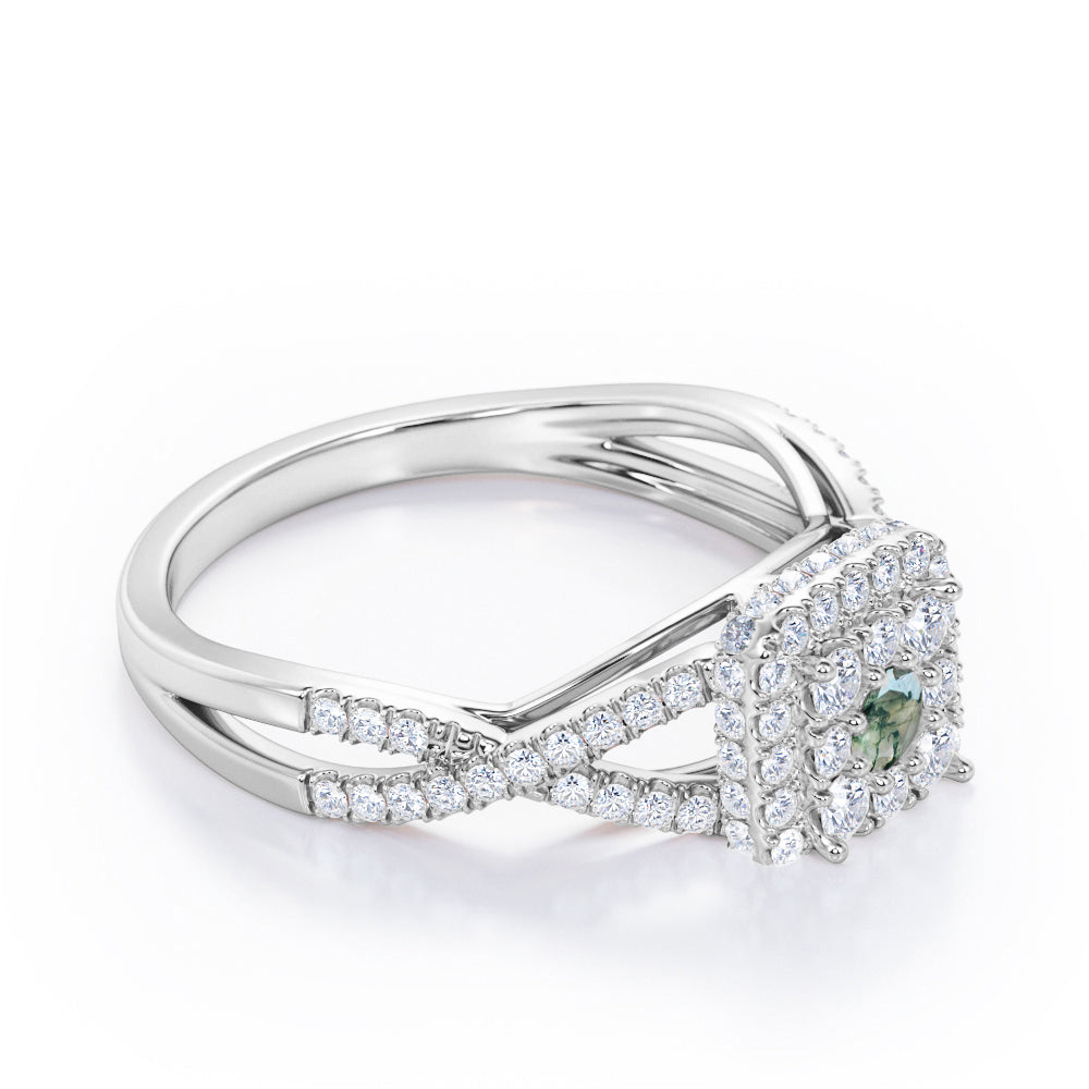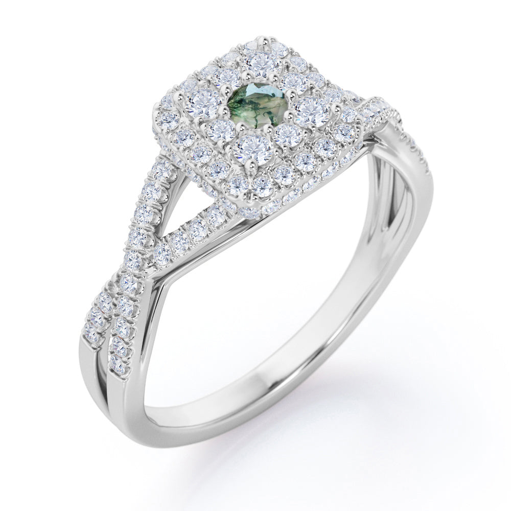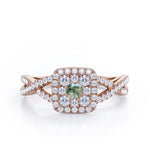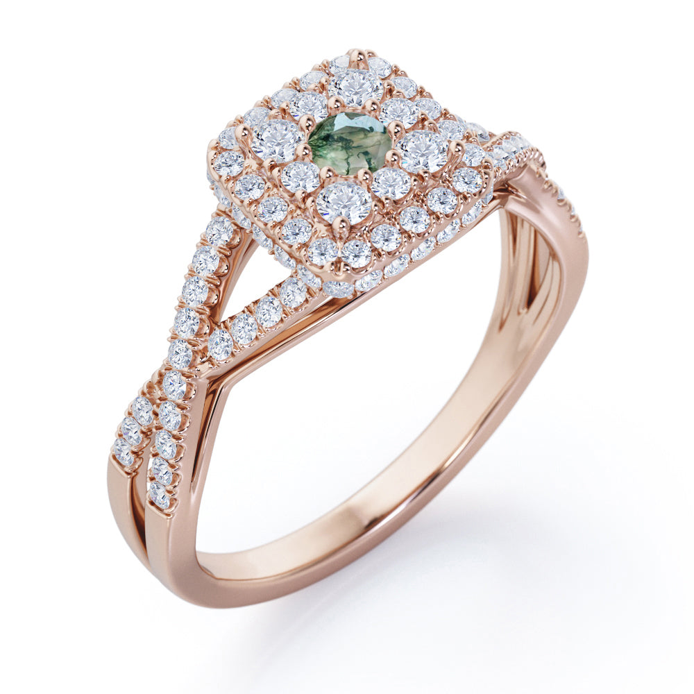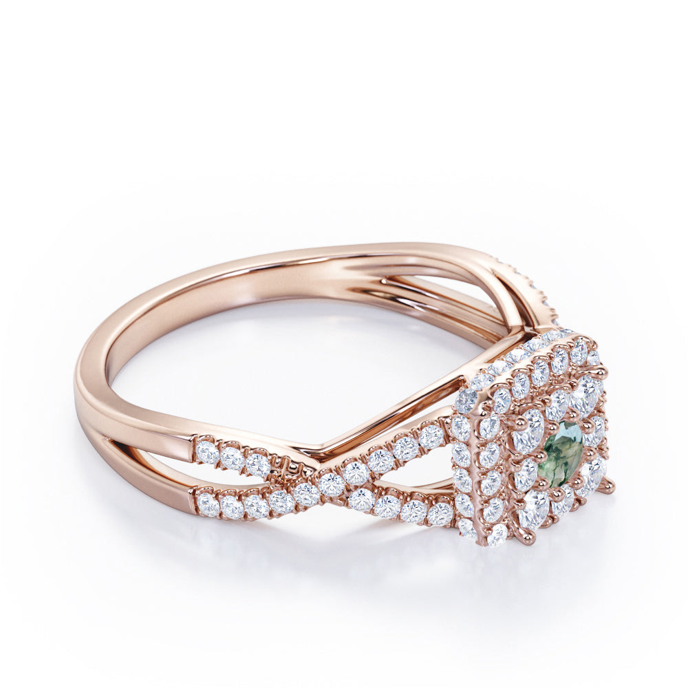 Pave Crossover - 1.25 Carat Round Cut Green Moss Agate and diamond - Flush Cluster Halo Engagement Ring in Rose Gold