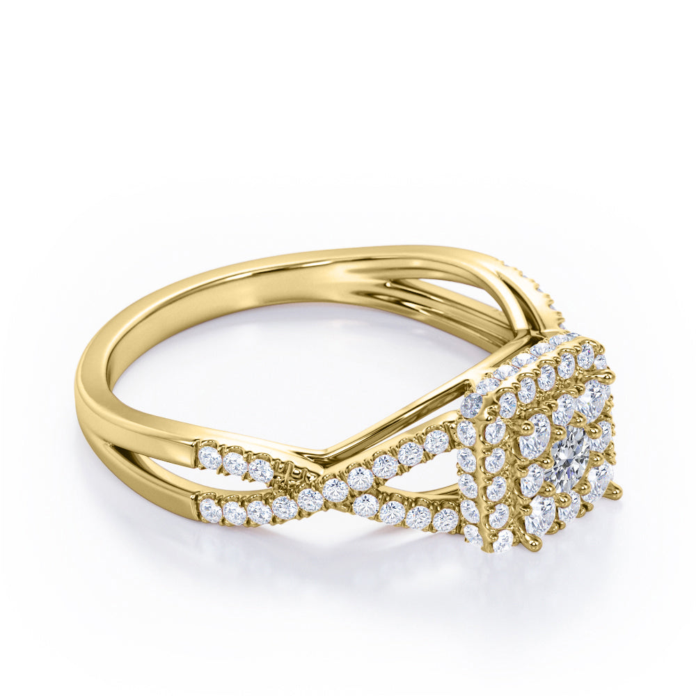 With this Pave Crossover - 1.25 Carat Round Cut Moissanite and diamond - Flush Cluster Halo Engagement Ring in Rose Gold, you can make your proposal day unforgettable. Handcrafted with care into a wonderful round cut moissanite by our most talented jewelers, this astonishing wedding anniversary ring is composed of solid 0.5 carat moissanite in the center with 0.75 carat sparkling diamond side stones. For those looking for something a little out of the ordinary, this natural engagement ring is an excellent choice. with its dazzling beauty, this cheap wedding ring is magnificent in its brilliance and clarity and will be an unmistakable addition to any jewelry collection. Beautiful and affordable, this cheap Moissanite ring is a great choice for any woman's jewelry collection. This cheap wedding ring, the birthstone ring for April, symbolically represents love and dedication, is the best gift you can give to your significant other. Also, this cheap Moissanite ring can be customized, either in white gold, rose gold, yellow gold, black gold, upon customer request. Your love story will be complete with this real Moissanite ring for women.