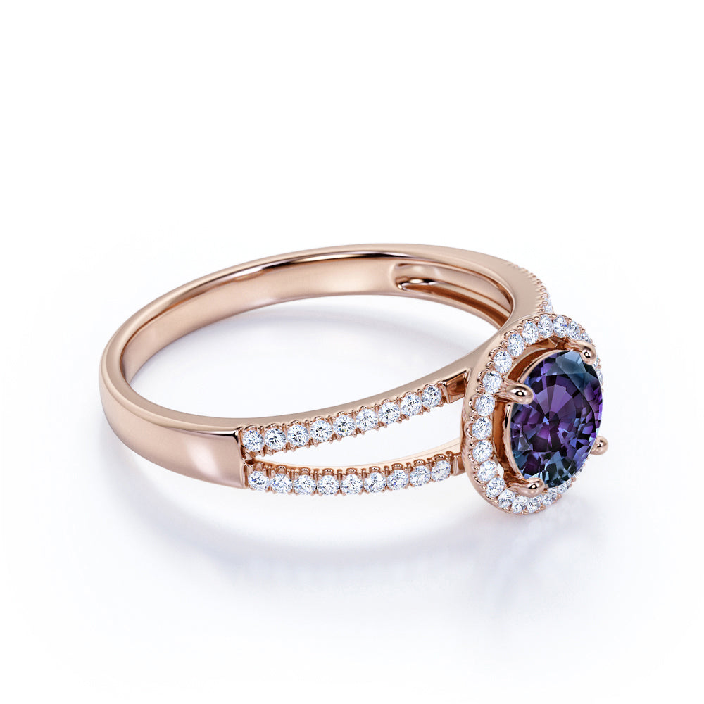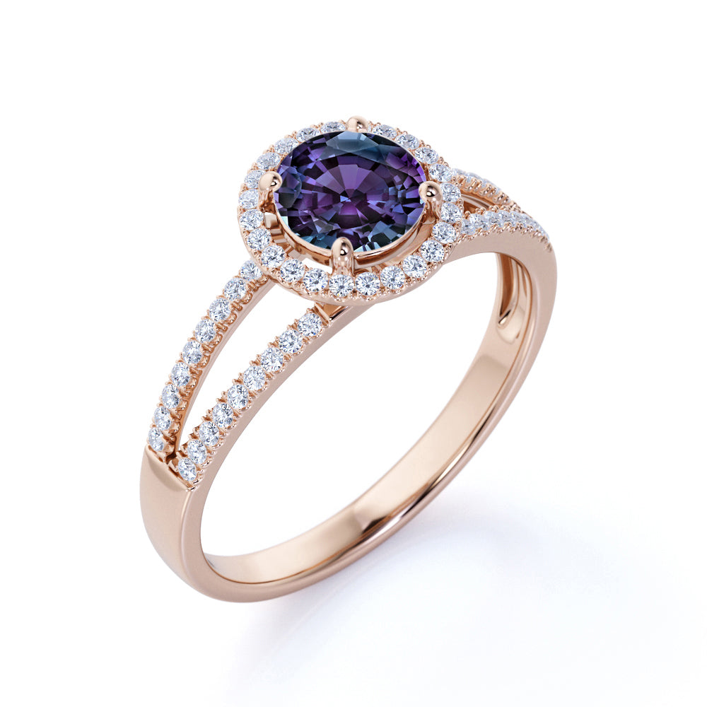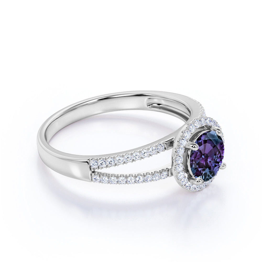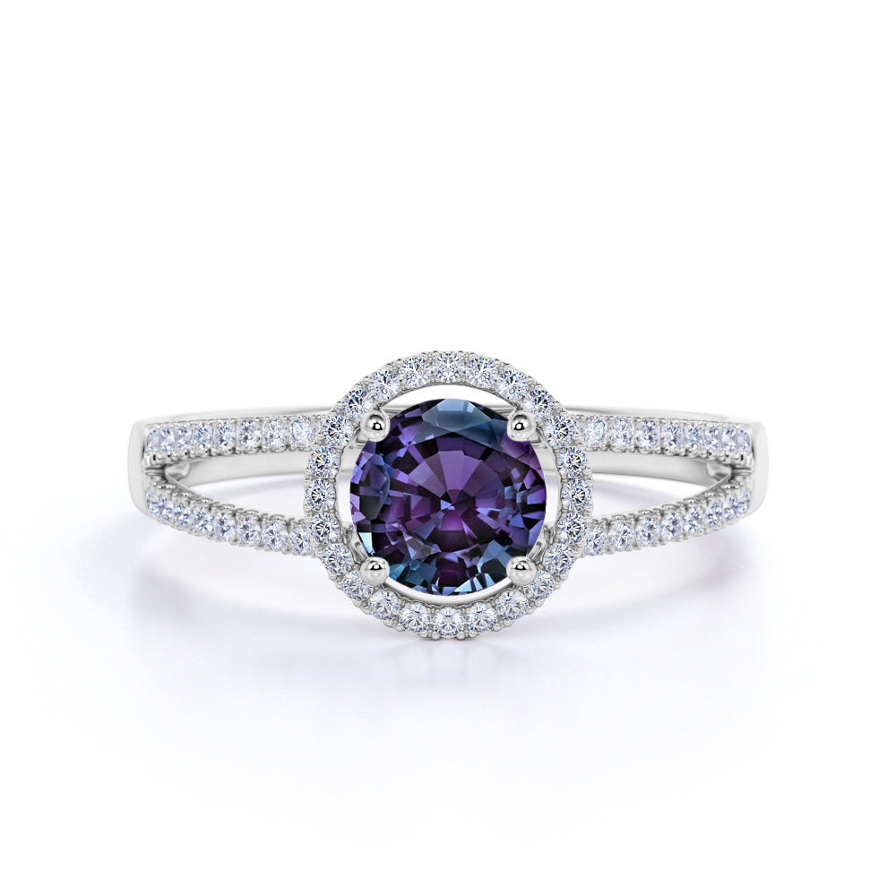 Pave Double Shank 1.50 Carat Round Cut Synthetic Alexandrite and Diamond Halo Modern Engagement Ring