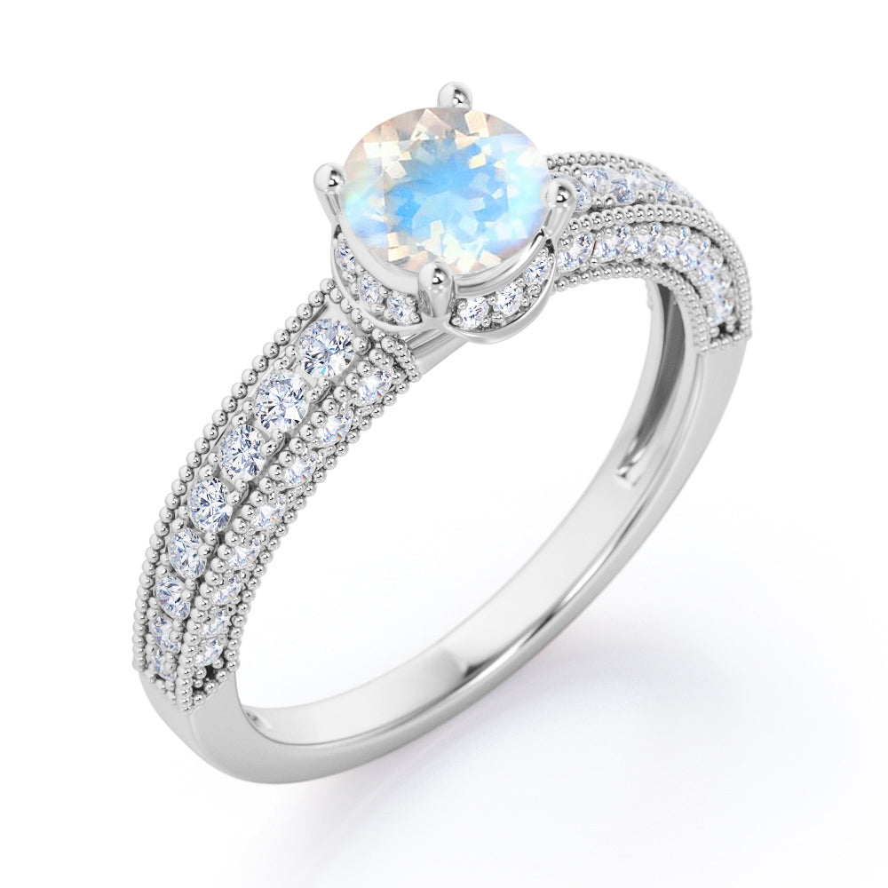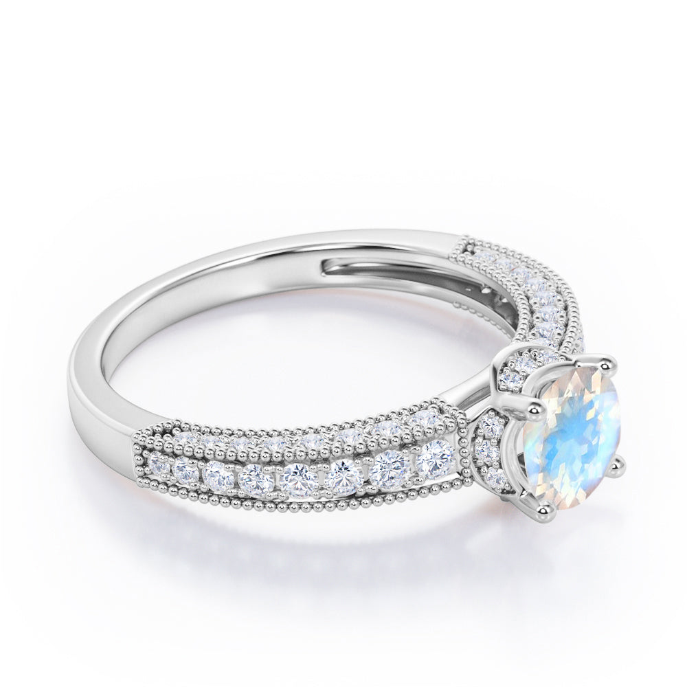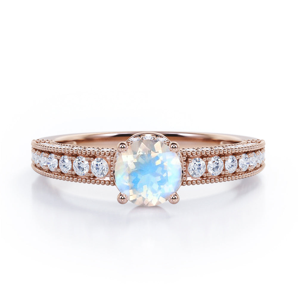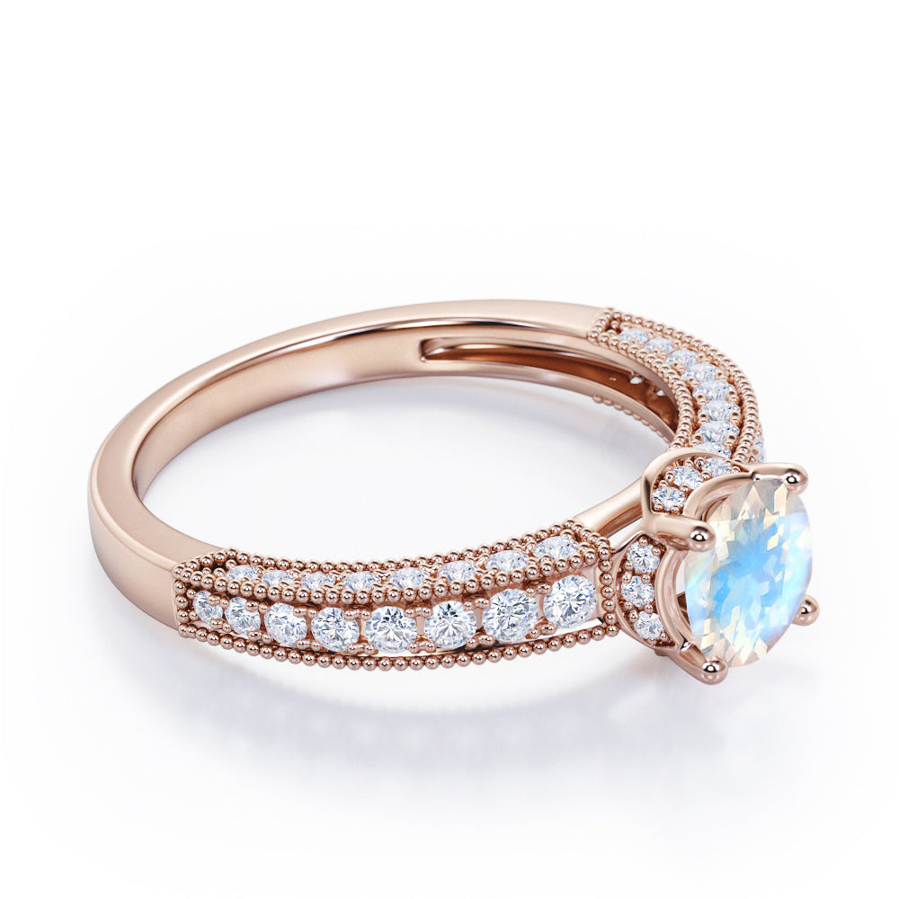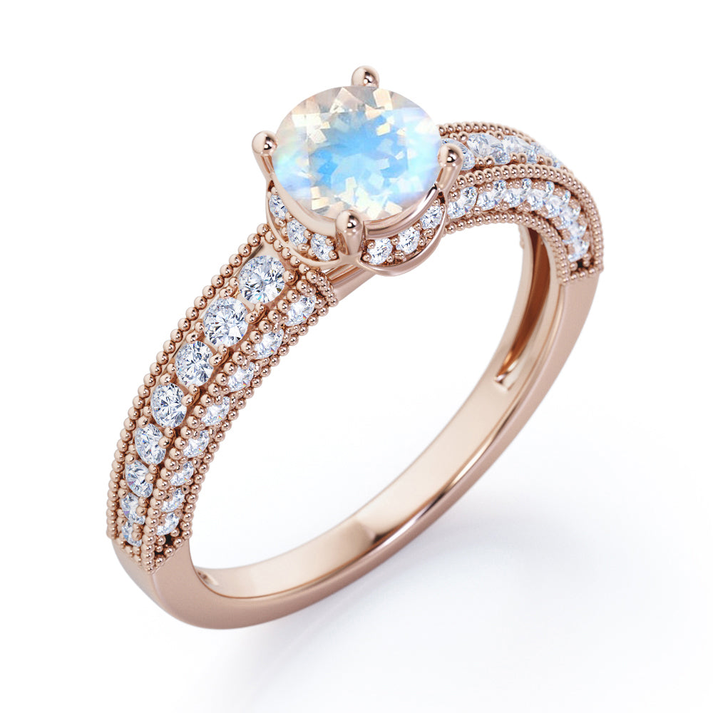 Pave Four Prong 1.45 Carat Round Cut Moonstone And Diamond Vintage Milgrain Engagement Ring In Rose Gold