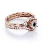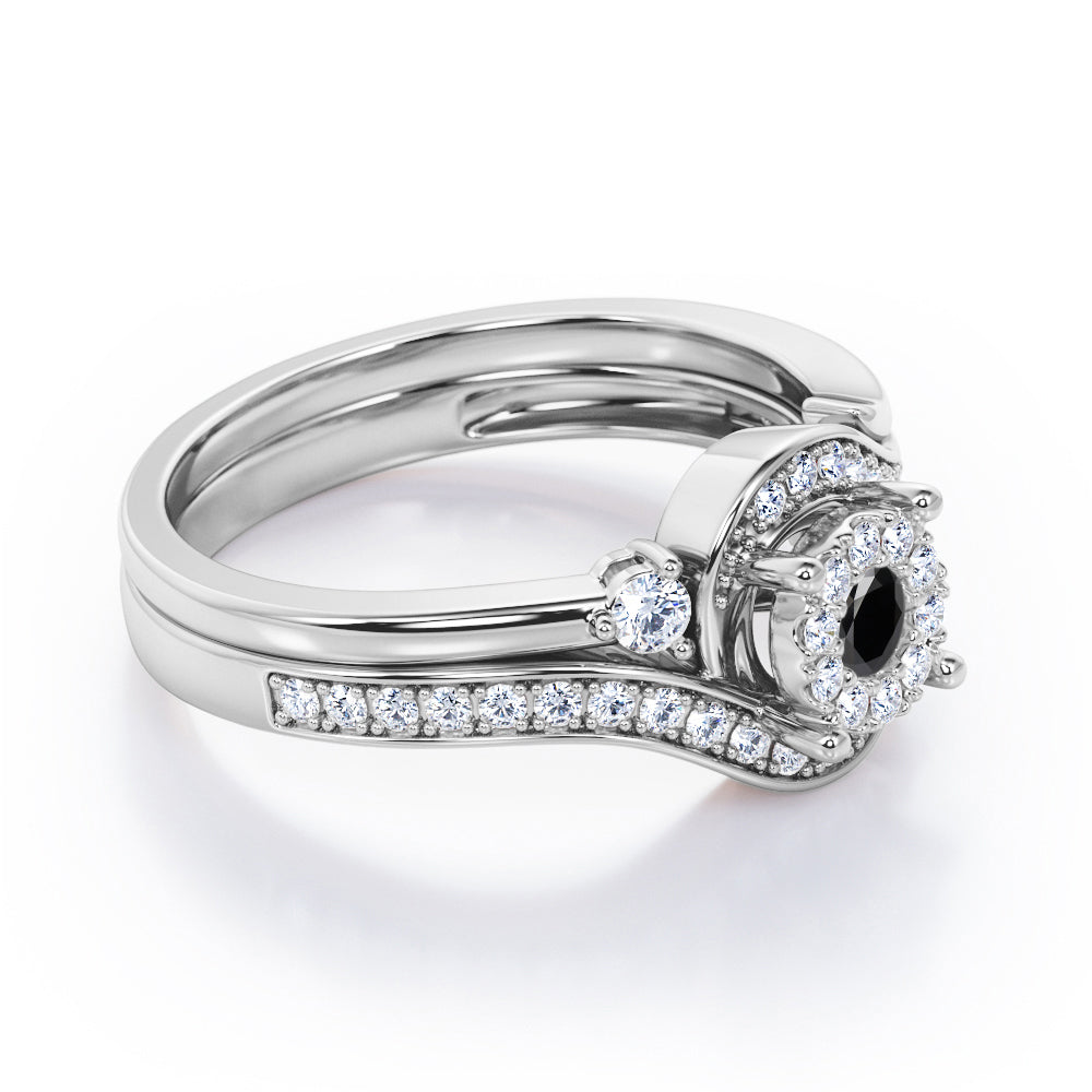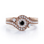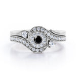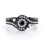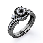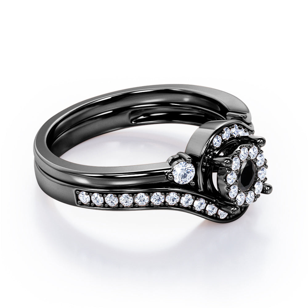Classic but also unique. A Pave-Prong Design 0.55 TCW Round Shape Black Diamond Bridal Ring Set in Black Gold. The engagement ring features a 0.33 carat round Black diamond that is surrounded by paved small round Moissanite for silver ring and diamonds for gold ring. The band is curved into an S-shape like and adorned by petite round Moissanite by half of the band. Comes with this bypass style ring is an open shank wedding band that matched perfectly with the promise ring. The distorted wedding band is a plain well-polished ring with two dainty Moissanite; these two stones align in an oblique shape with the center stone as well as the band. You can choose either 18k gold over silver, 10k gold or 14 gold to be your metal of the ring with 4 colors as your options; white gold, rose gold, yellow gold and black gold.