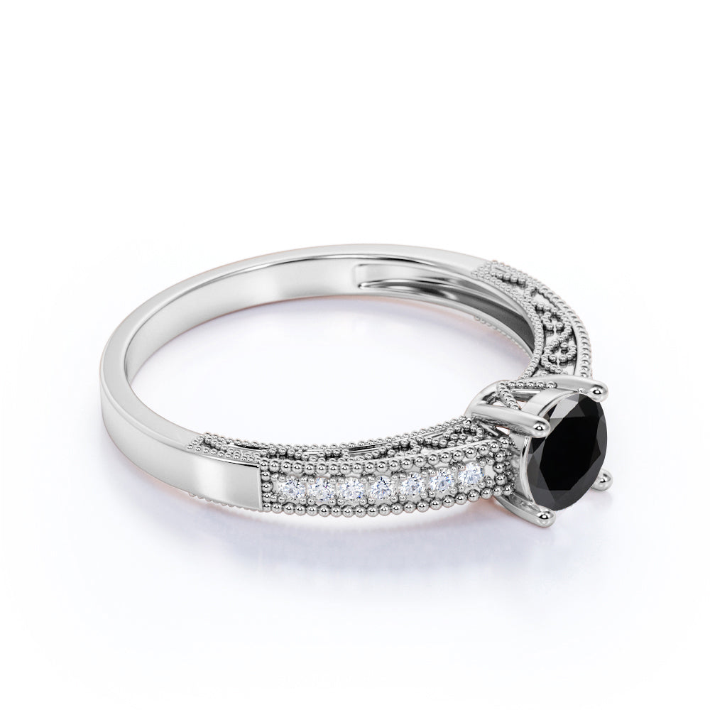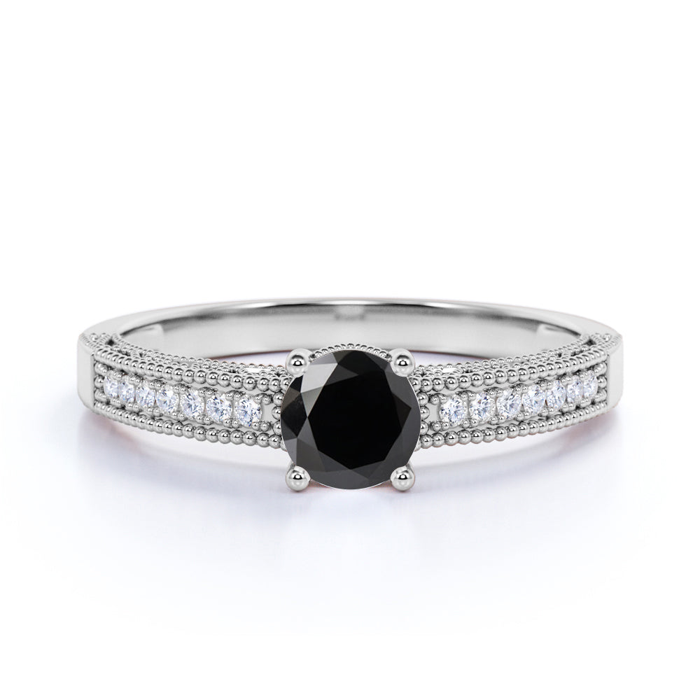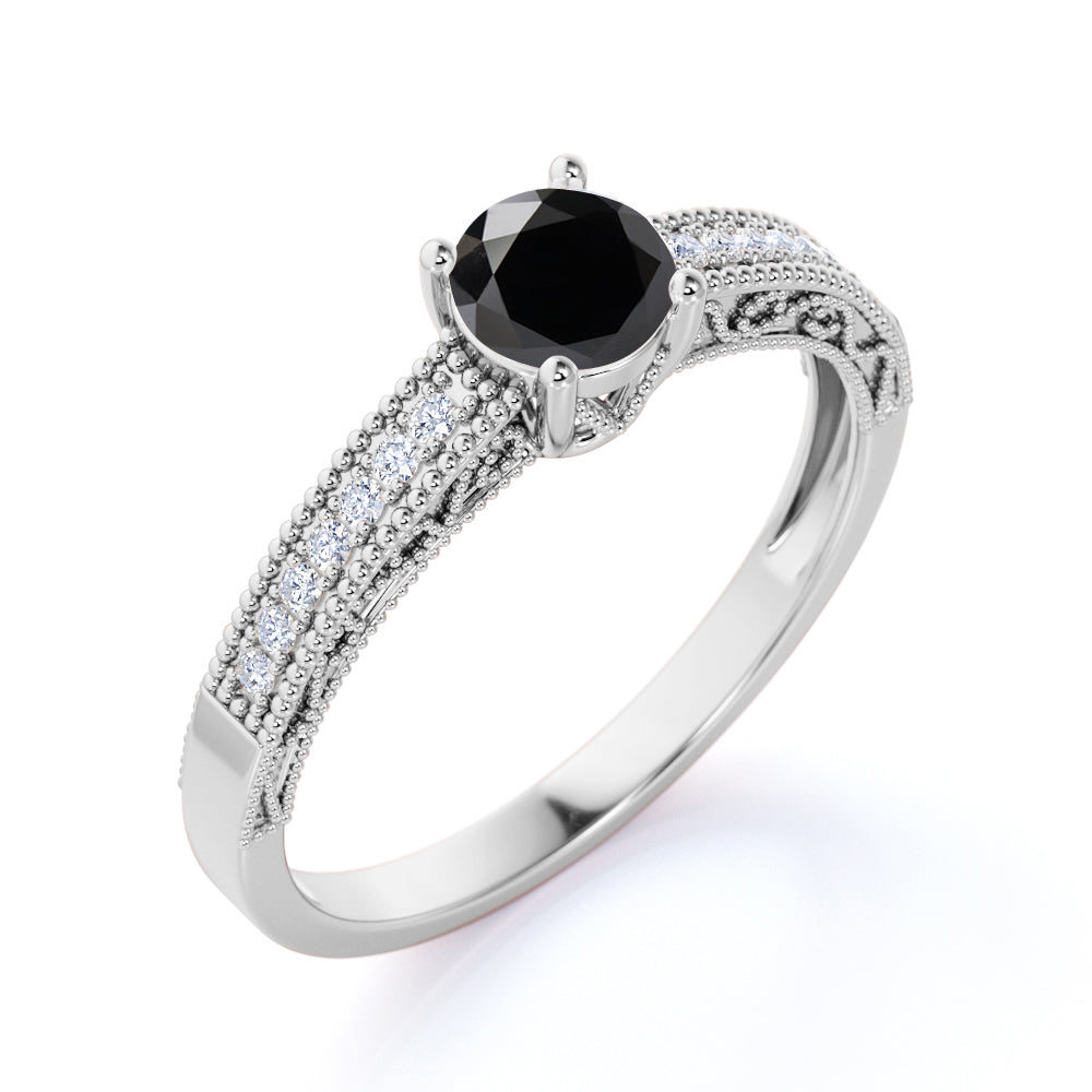 Pave Setting 1.50 Carat European Round Lab Black Diamond and Milgrain Engagement Ring in White Gold