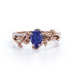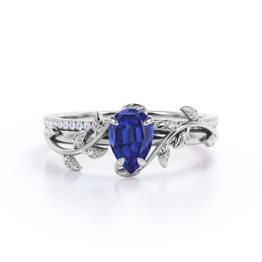 Elevate your style with our Pave style 1.25 carat Pear Cut Lab-Created Sapphire and Diamond floral wedding ring set in White Gold. Handmade with utmost precision and attention to detail, this exquisite set exudes timeless elegance. The pear cut lab-created Sapphire takes center stage, accentuated by a dazzling diamond pave setting, reminiscent of the glamorous Art Deco era. With its luxurious design and affordable price, this ring set is a true treasure. Choose from a range of metal colors including white gold, rose gold, yellow gold, and black gold in silver, 10k, and 14k gold variants, allowing you to personalize your jewelry to match your unique style. Nature-inspired designs are a great and trending option for engagement rings as they symbolize the beauty of the natural world and capture the essence of romance and everlasting love. This stunning ring set showcases the perfect balance between vintage charm and contemporary elegance, making it a timeless choice for any special occasion. Celebrate your love with this remarkable piece that will leave a lasting impression. Moreover, please note the side stones of this ring will change according to the metal variant chosen: the silver metal options are accompanied by sparkling moissanite side stones, while the 10k and 14k solid gold metals showcase dazzling diamond side stones.