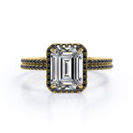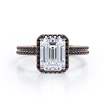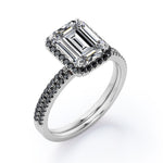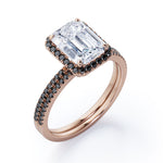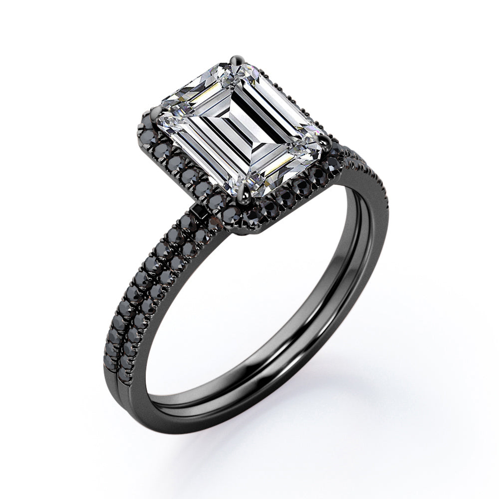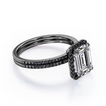 Be shinily standout from the crowd with this Pave Style - 1.75 TCW Emerald Cut Moissanite with Lab Created Black Diamond - Halo Setting Wedding Ring Set in Black gold. Professionally handcrafted into a fine emerald cut by our skilled jewelers, this alluring moissanite stone ring set integrates total 1.75 carat moissanite and lab-created black diamonds. Special and non-traditional, this best moissanite rings set is well-suited for those who are not quite into normal lifestyle. With naked eyes moissanites look, shine and feel exactly like diamonds. With its glory and clarity, this moissanite and sterling silver ring set will absolutely enhance every style of its wearer. This near colorless moissanite ring set is beautiful and accessible since it is available at an affordable price. Moissanites are the most popular alternative gemstone for diamonds while being at lower and more affordable price. For those who have no idea what to surprise your life partners, this moissanite and sterling silver ring set can be a perfect gift for any occasion like engagements, Valentine's day, mother's day or anniversary. Additionally, this moissanite engagement ring set can be customized to your own choice of metal colors: White gold, rose gold, yellow gold and black gold in 18k Gold over Silver, 10k and 14k gold metal options. In regards to its hardness, moissanite is almost as hard as diamond which means that it is notably durable. Let’s impress her with this best moissanite ring set, and she will be eternally joyful.