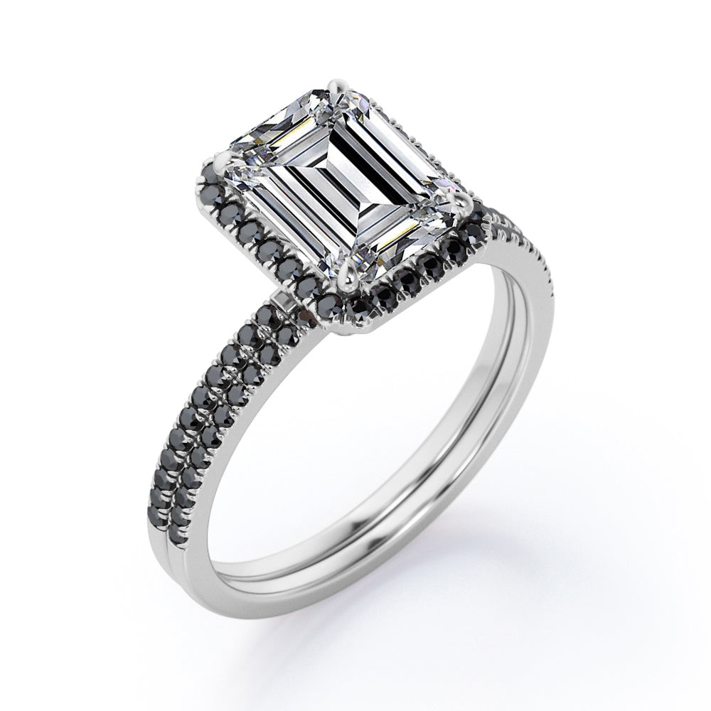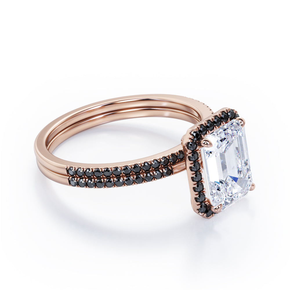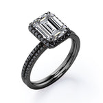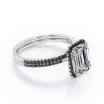 Pave Style - 1.75 TCW Emerald Cut Moissanite with Lab Created Black Diamond - Halo Setting Wedding Ring Set in Black Gold