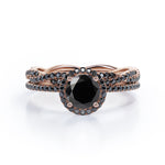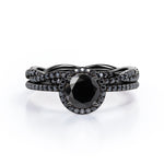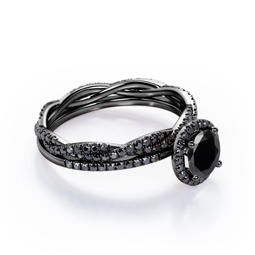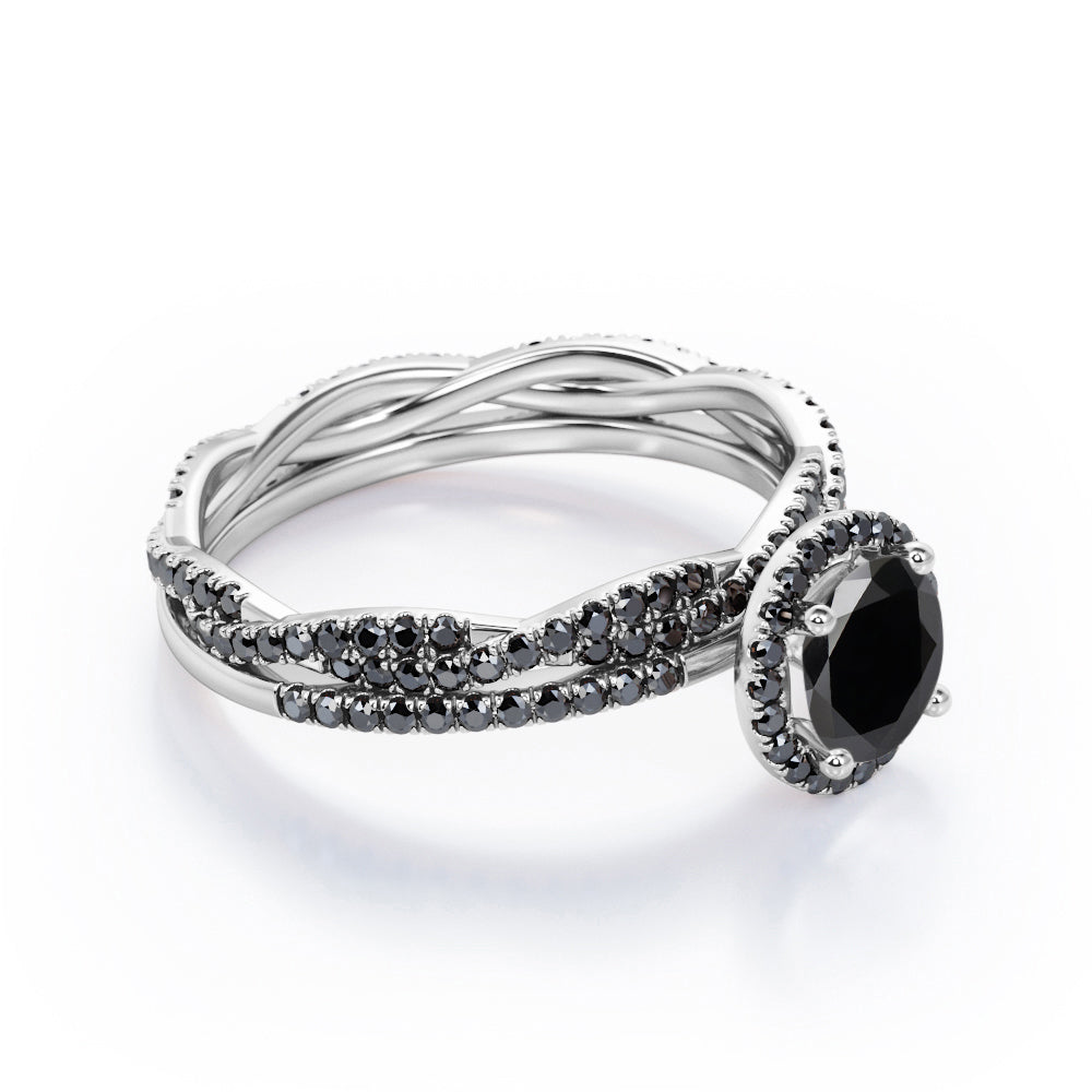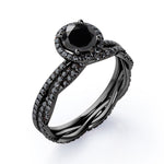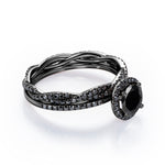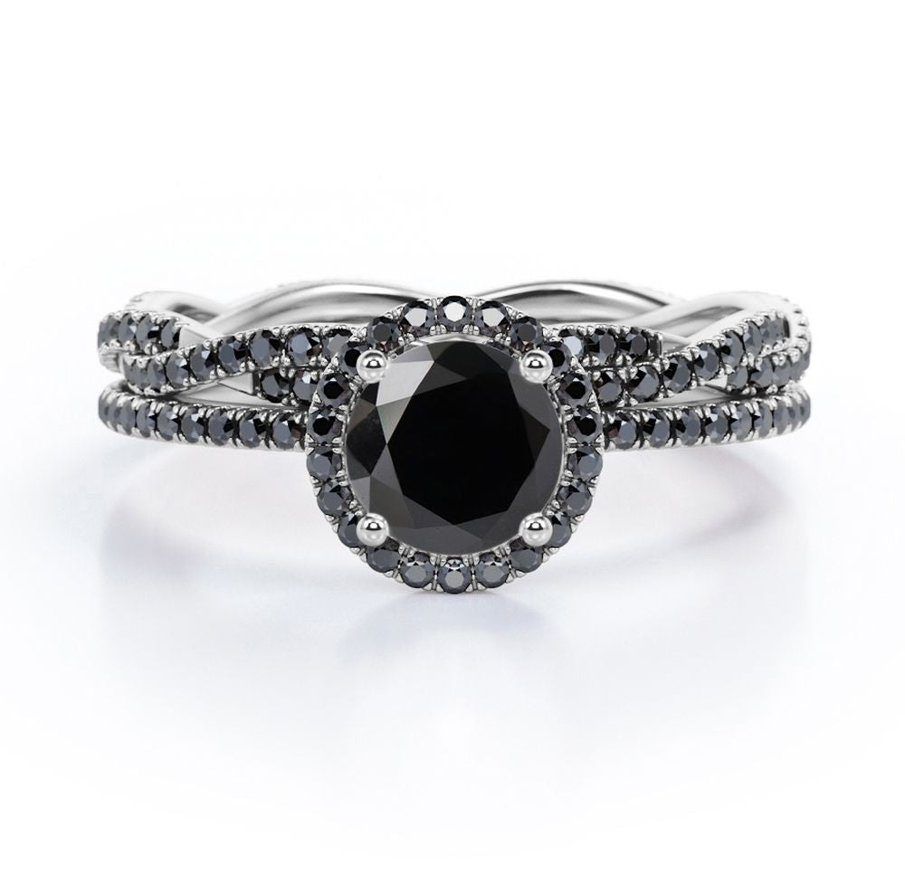 Start the greatest love story of your life with this Pave Twisted Eternity 1.75 TCW Round Brilliant Cut Lab Created Black Diamond Halo-Style Wedding Ring Set in White Gold. Professionally handcrafted into a fine round cut by our experts in lapidary, this alluring black diamond jewelry consists of total 1.75 carat lab created black diamond on solid white gold. Special and non-traditional, this statement black diamond rings set is well-suited for those who are not quite into normal lifestyle. With its enchanting color, this black diamond stone engagement ring set will absolutely enhance every style of its wearer. This black diamond band set is beautiful and accessible since it is available at an affordable price. If you are looking for a special gift for your friends or your better half, this black diamond anniversary band set, symbolically representing love, good fortune and creativity, will be the greatest choice you will ever make. Additionally, this black diamond gemstone jewelry can be customized to your own choice of metal colors: white gold, rose gold, yellow gold or black gold in 10k and 14k gold metal options. Let's fulfill your love story with this black diamond sterling silver ring set and, surely, she will not regret it.