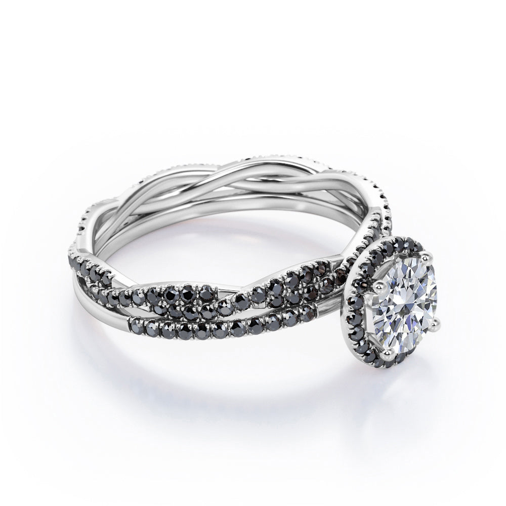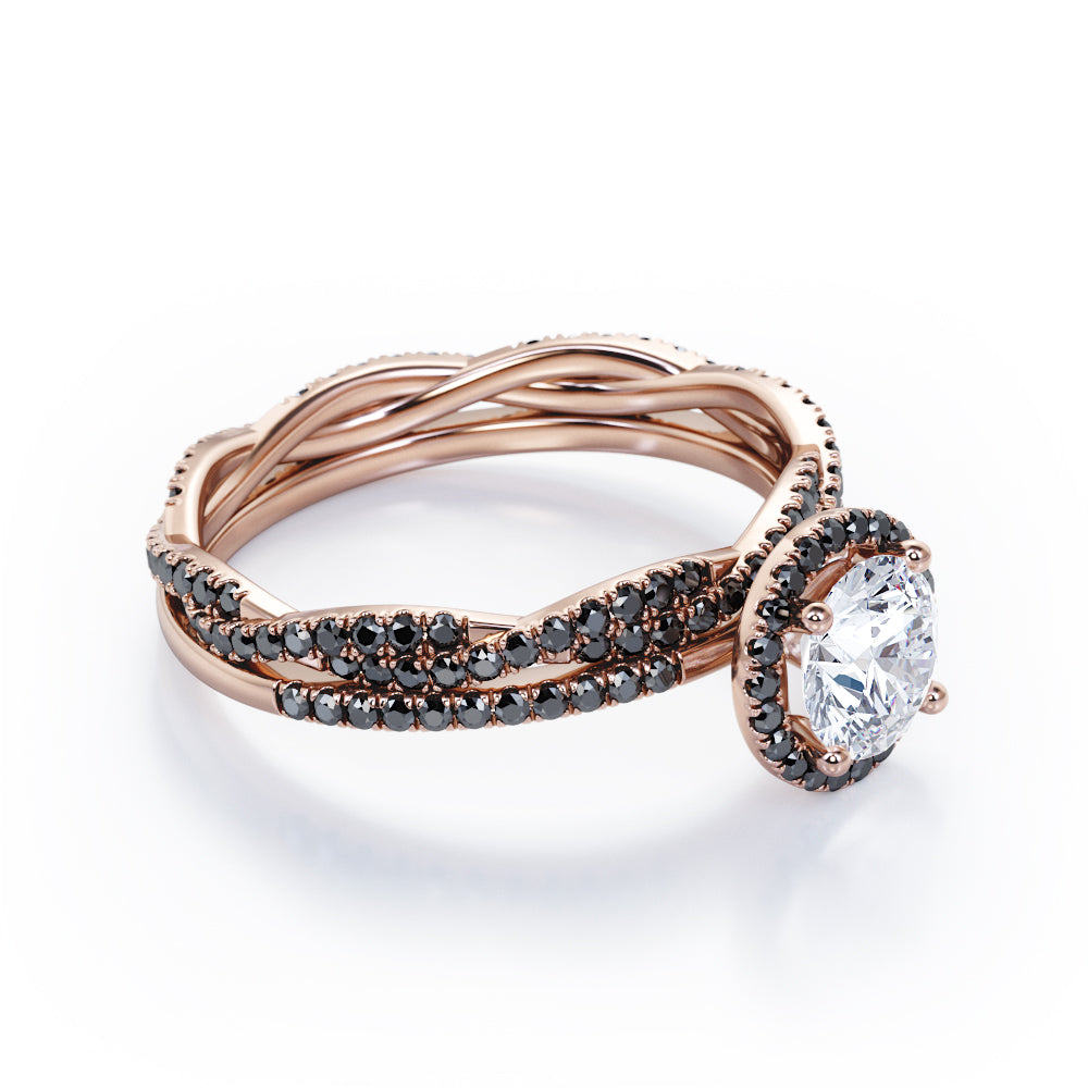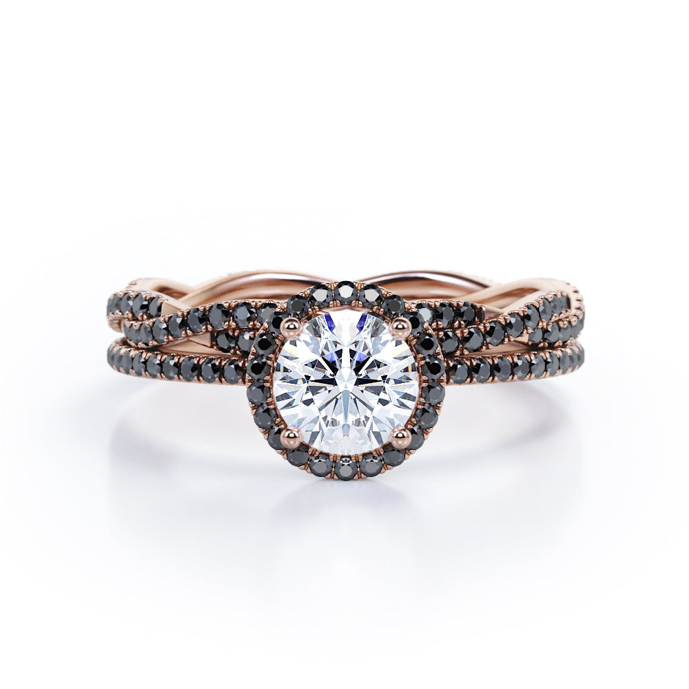 Pave Twisted Eternity 1.75 TCW Round Brilliant Cut Moissanite with Lab Created Black Diamond Halo-Style Wedding Ring Set in Rose Gold