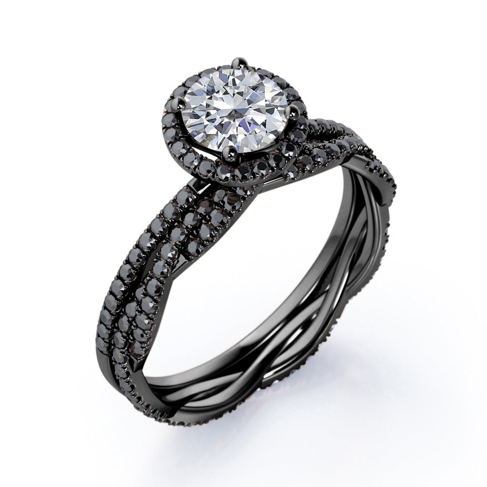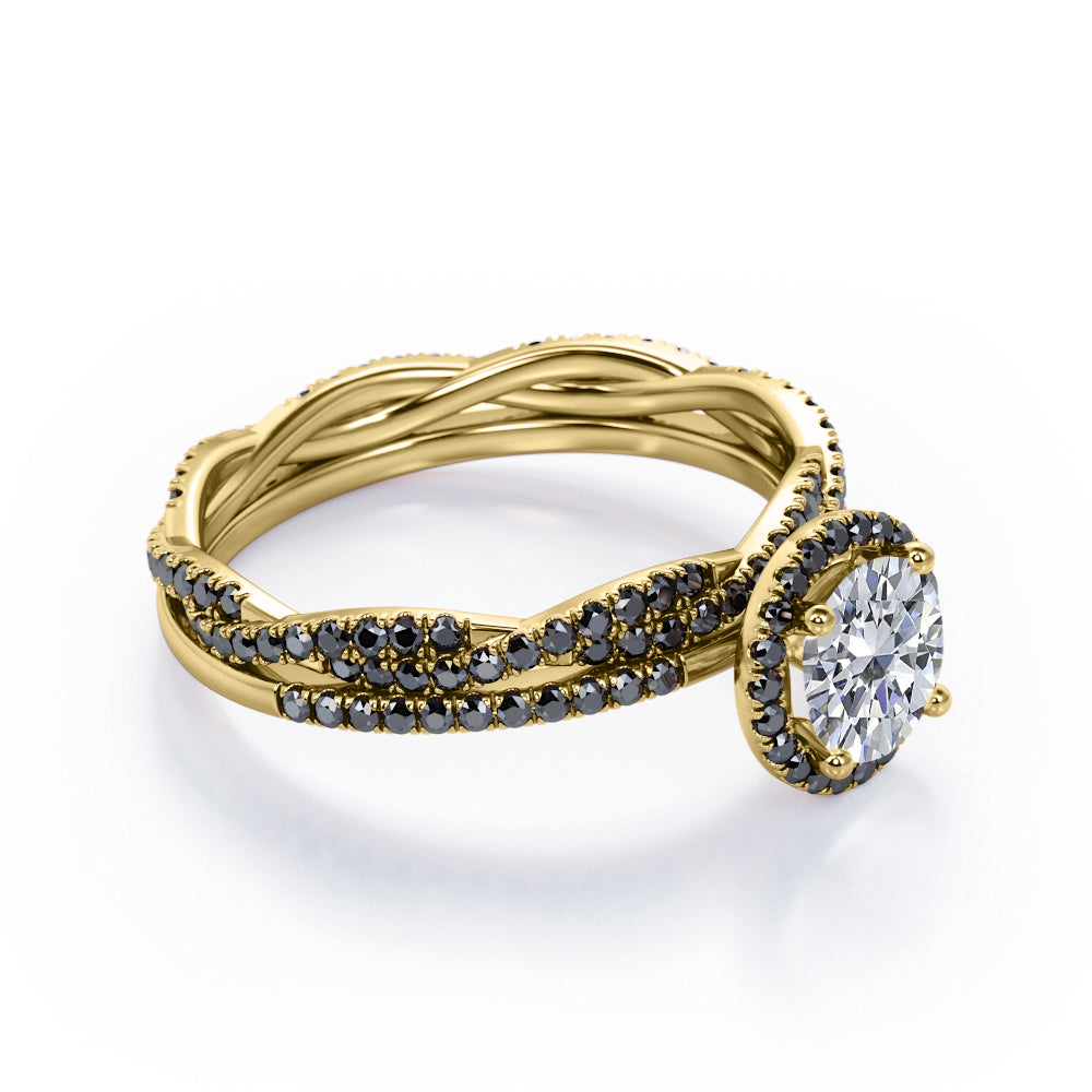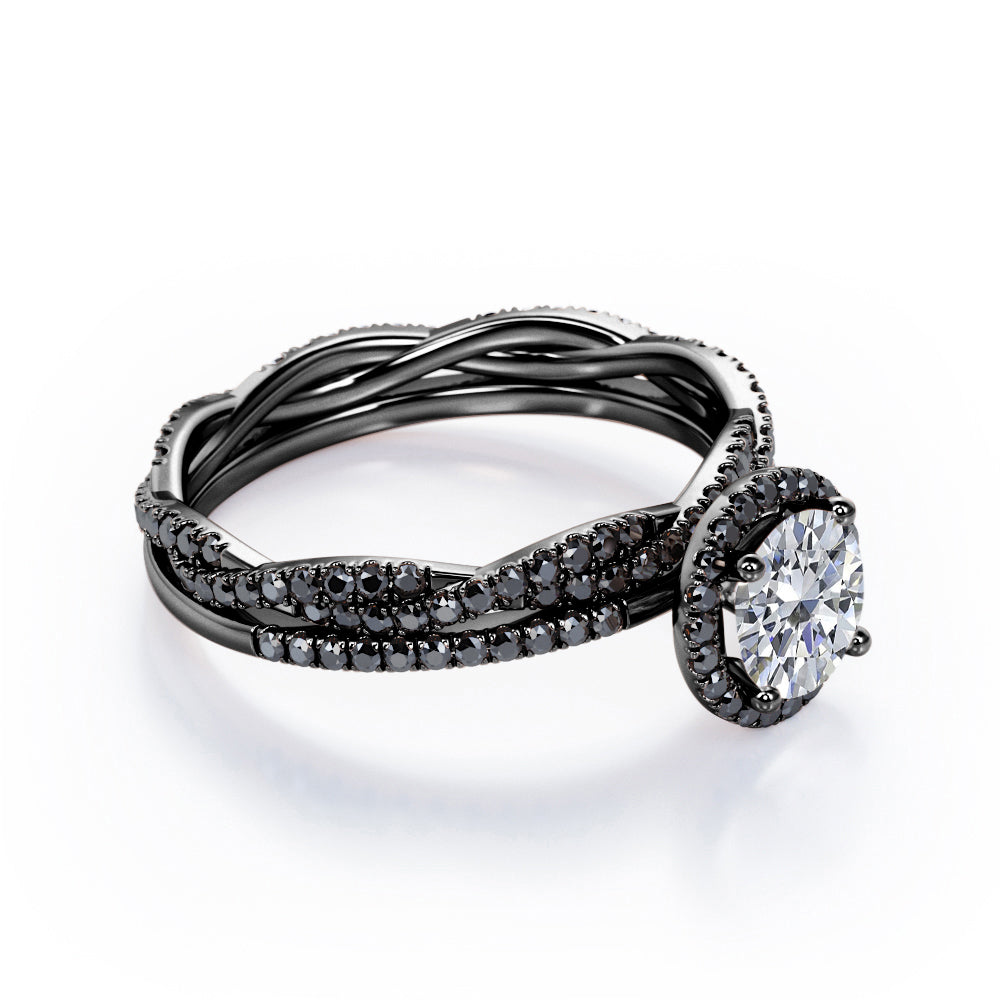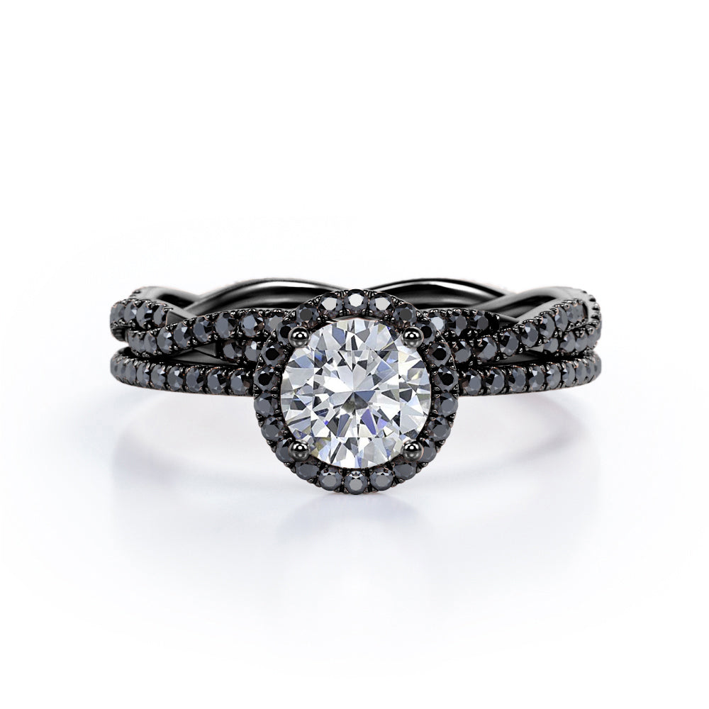 Pave Twisted Eternity 1.75 TCW Round Brilliant Cut Moissanite with Lab Created Black Diamond Halo-Style Wedding Ring Set in Rose Gold