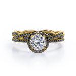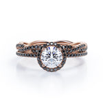 Make someone you love feel amazed by the brilliance of this Pave Twisted Eternity 1.75 TCW Round Brilliant Cut Moissanite with Lab Created Black Diamond Halo-Style Wedding Ring Set in Rose gold. Professionally handcrafted into a fine round cut by our experts in lapidary, this alluring sterling silver moissanite engagement rings set combines total 1.75 carat moissanite and lab-created black diamonds. Distinctive and extraordinary, this moissanite anniversary rings set is perfect for those who would love to express their charisma and uniqueness. With naked eyes moissanites look, shine and feel exactly like diamonds. Reflective properties of this best moissanite rings set will absolutely enhance every style of its wearer. This near colorless moissanite ring set is beautiful and accessible since it is available at an affordable price. Moissanites are the most popular alternative gemstone for diamonds while being at lower and more affordable price. Considered as a symbol of timeless love and affection for your lover, this moissanite wedding rings set can definitely help you out. This moissanite band rings set can be customized, either in White gold, rose gold, yellow gold or black gold in 18k Gold over Silver, 10k and 14k gold metal options upon customer request. In regards to its hardness, moissanite is almost as hard as diamond which means that it is notably durable. Let’s impress her with this moissanite engagement rings set, and she will be eternally joyful.