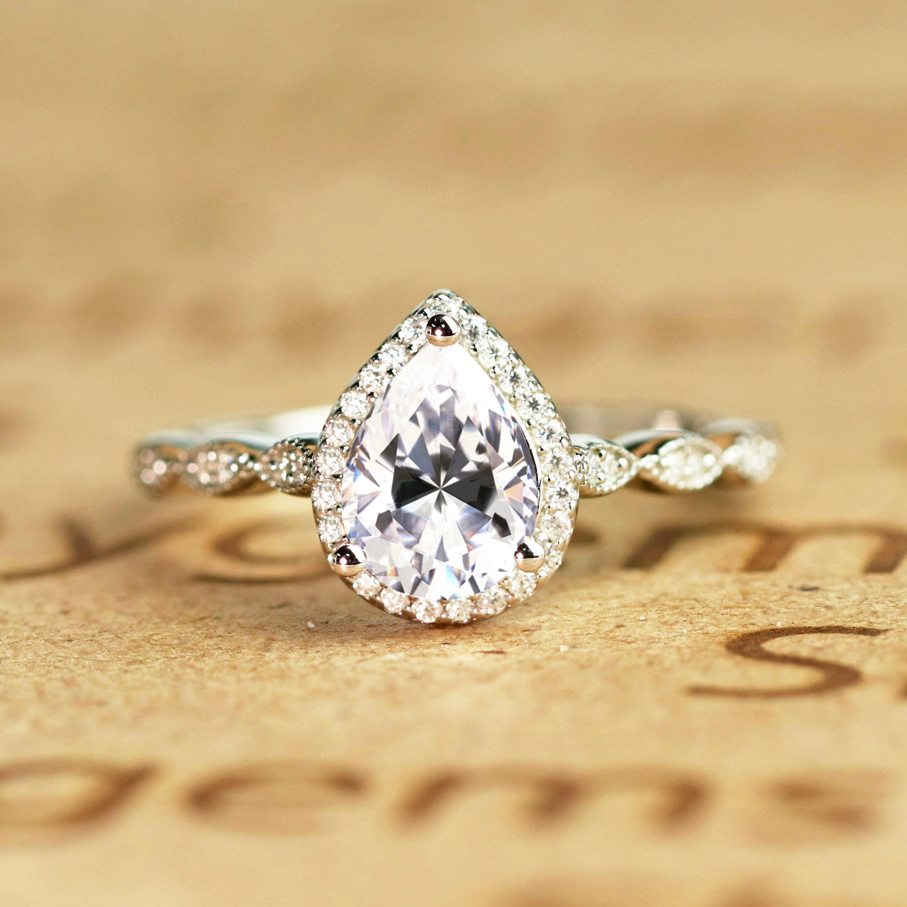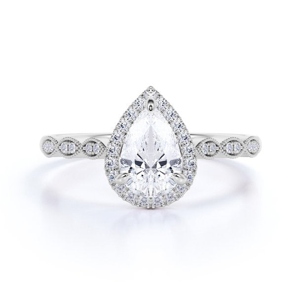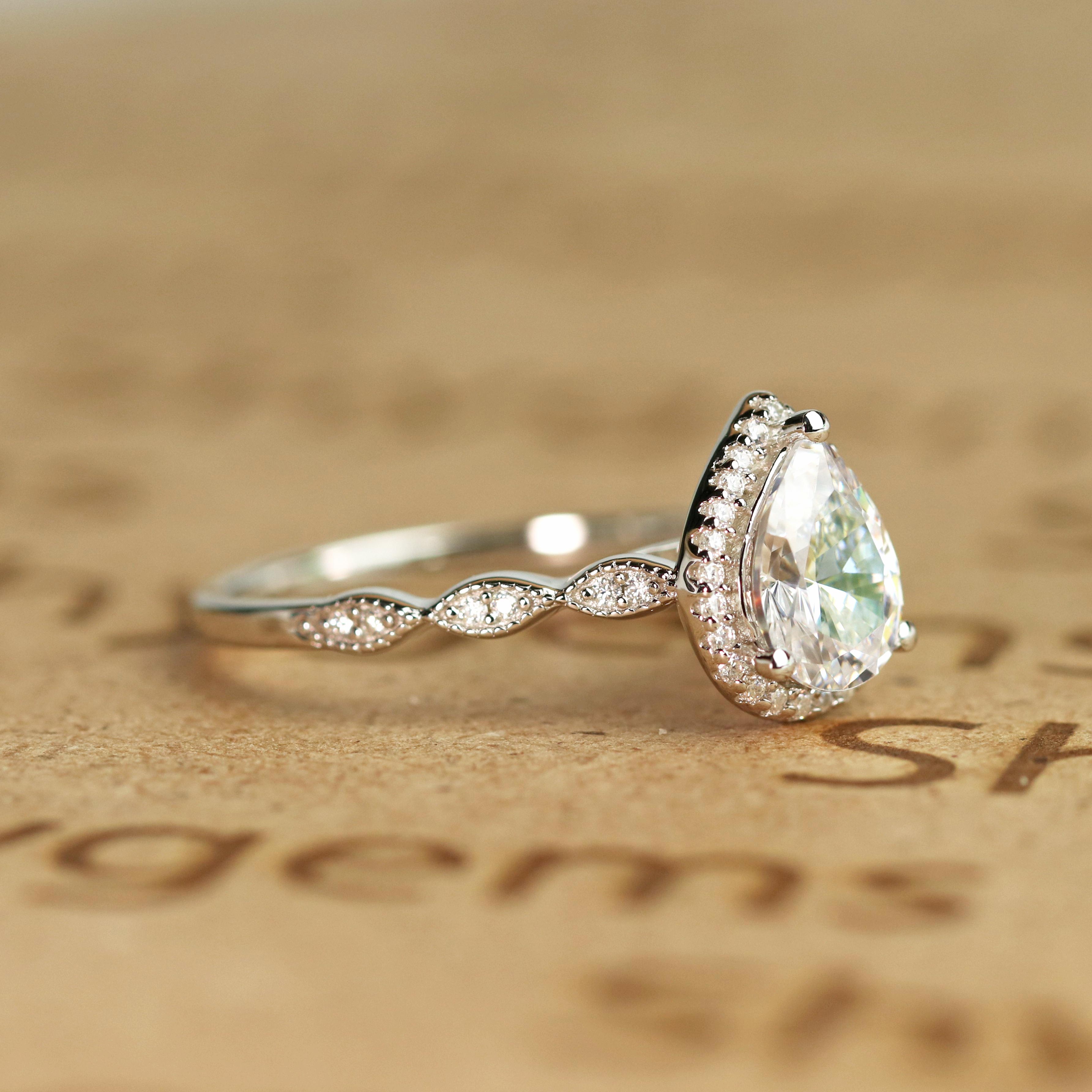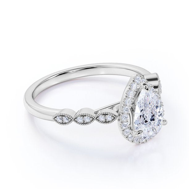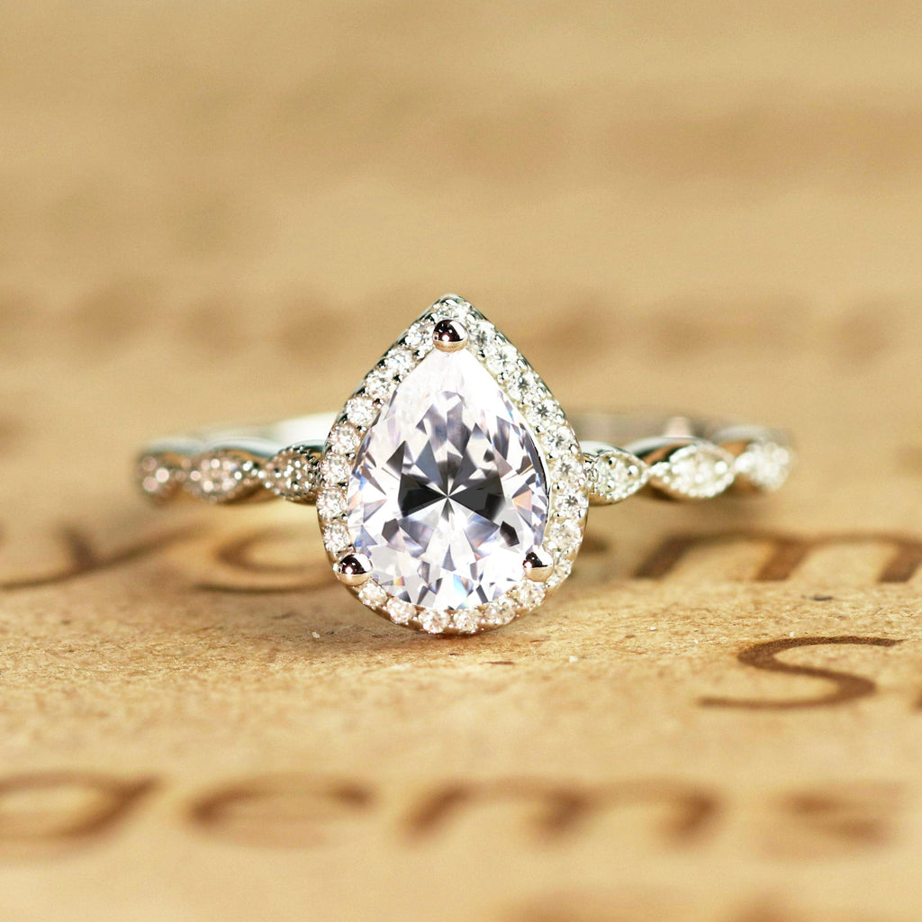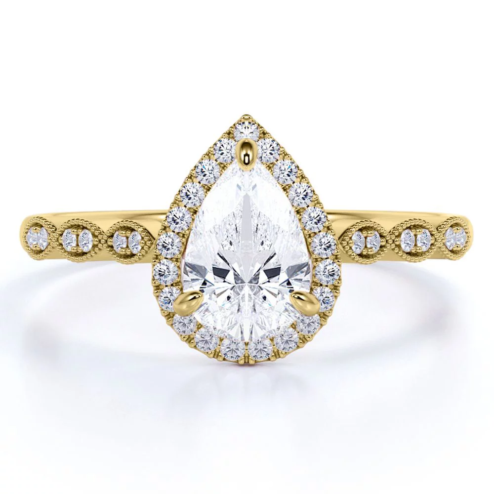 Vintage 1.25 Carat Moissanite Pear Cut Halo Engagement Ring