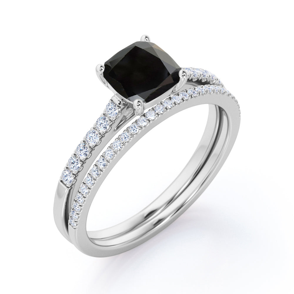 Perfect 1.50 Carat Princess cut Black Diamond Bridal Ring Set in Rose Gold. Affordable yet designer black Diamond affordable wedding ring set with engagement ring and wedding bands showcases total 1.50 carats perfect lab created black diamond and glittering diamonds and is made in solid 10k Rose Gold. Break away from the generic look of mass-produced jewelry with this intricate handmade piece. And as always, the order comes with our 30 DAYS FULL REFUND policy, GUARANTEED DELIVERY within 5 Days, and in a BEAUTIFUL Jewelry Ring Box.
